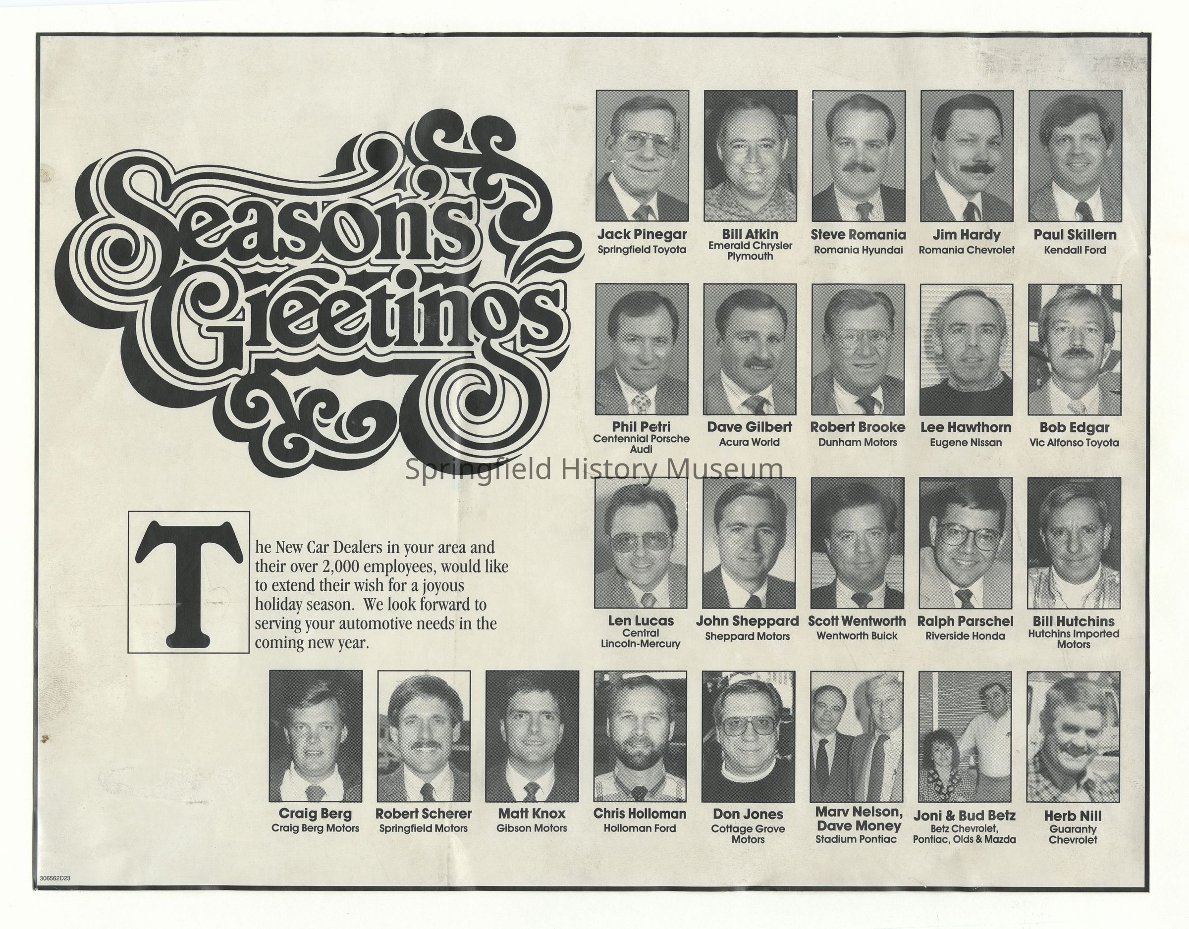 -Season's Greetings Poster, with portraits of New Car Dealers including Robert Scherer, undated, circa 1980, scanned