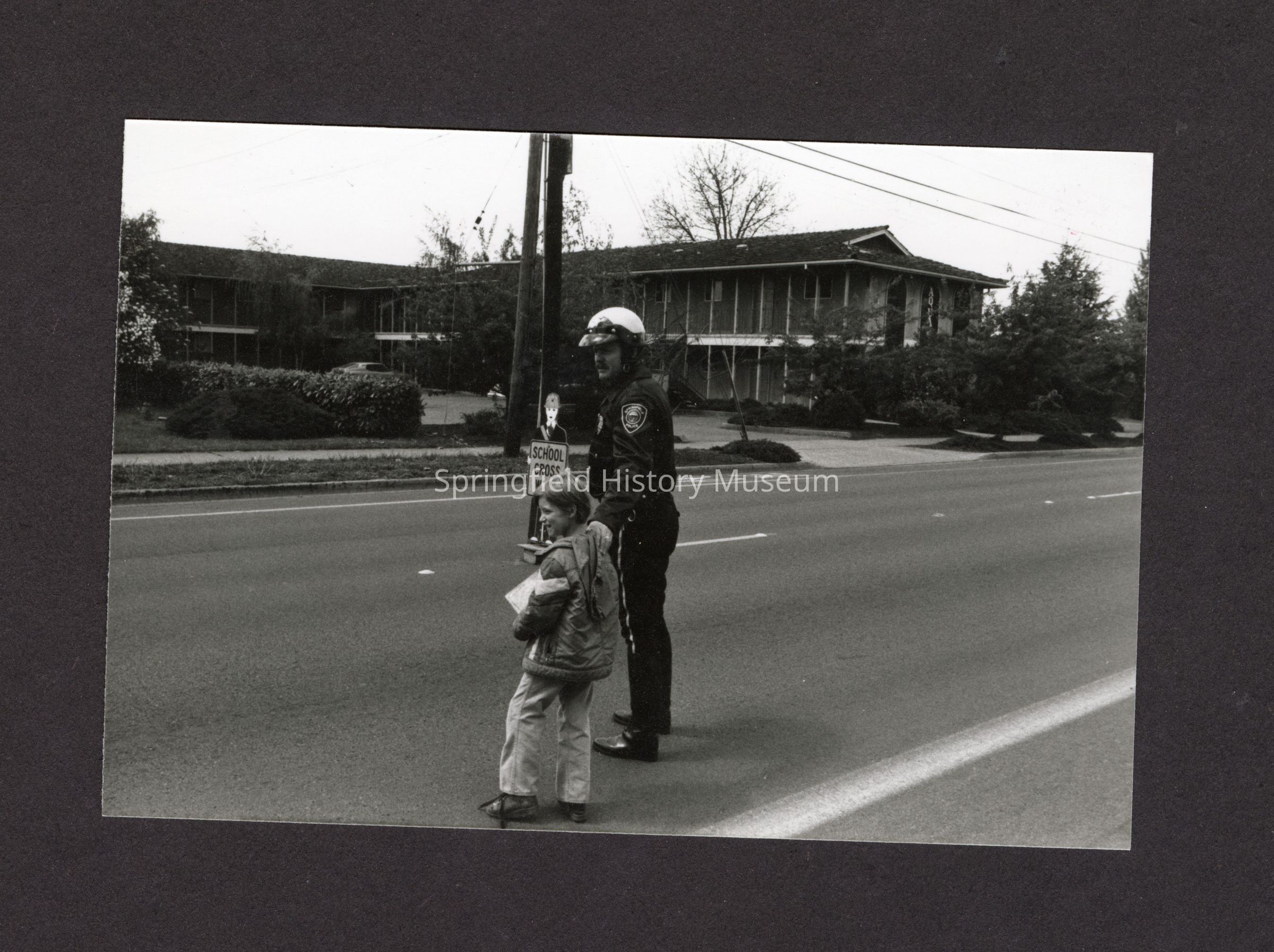 L) B&W photo of Motorcycle Police Officer helping children cross street in a school zone. No neg.