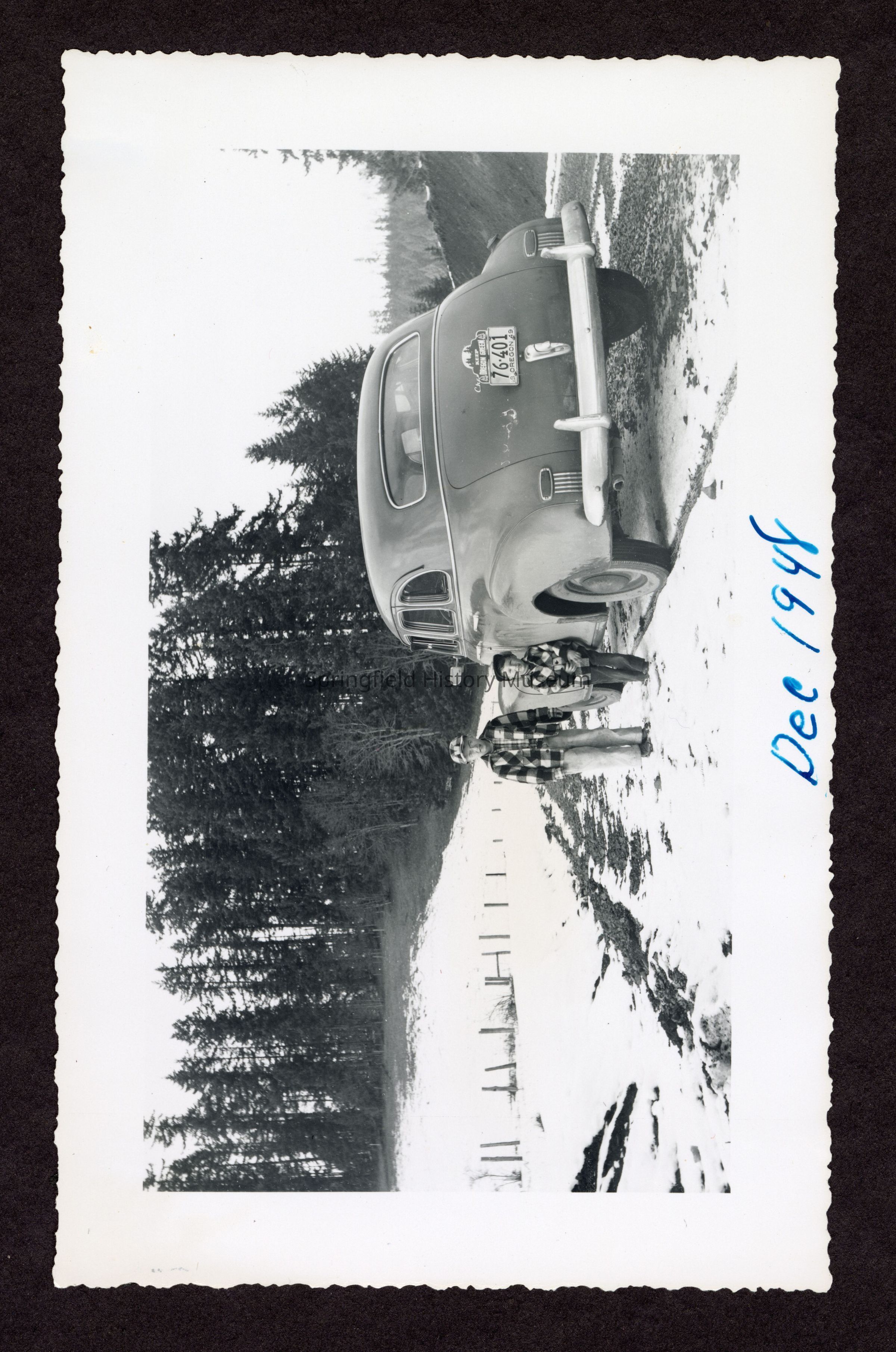 T) Photo of two children standing by car in the snow. December 1948.Other Names and Numbers