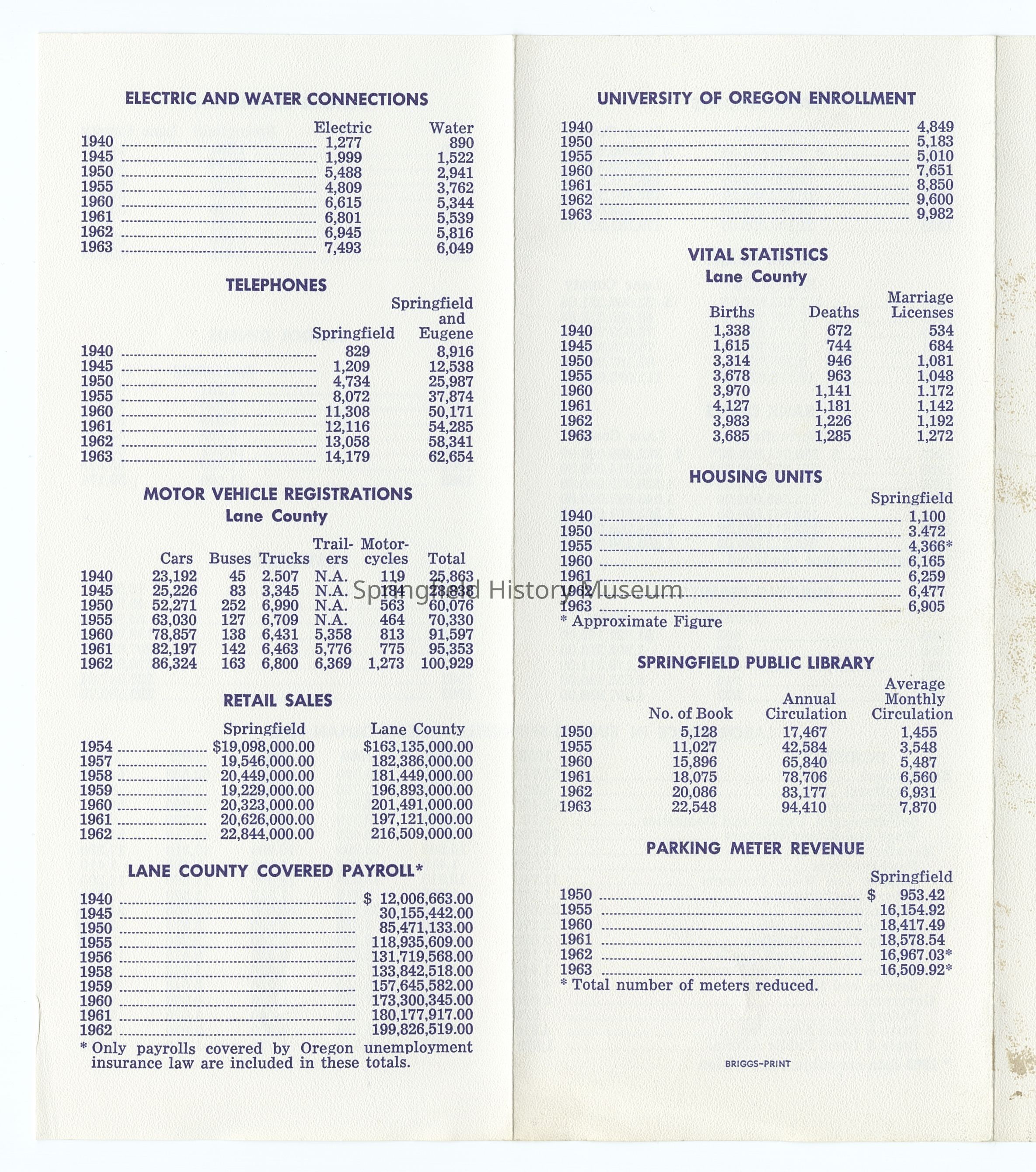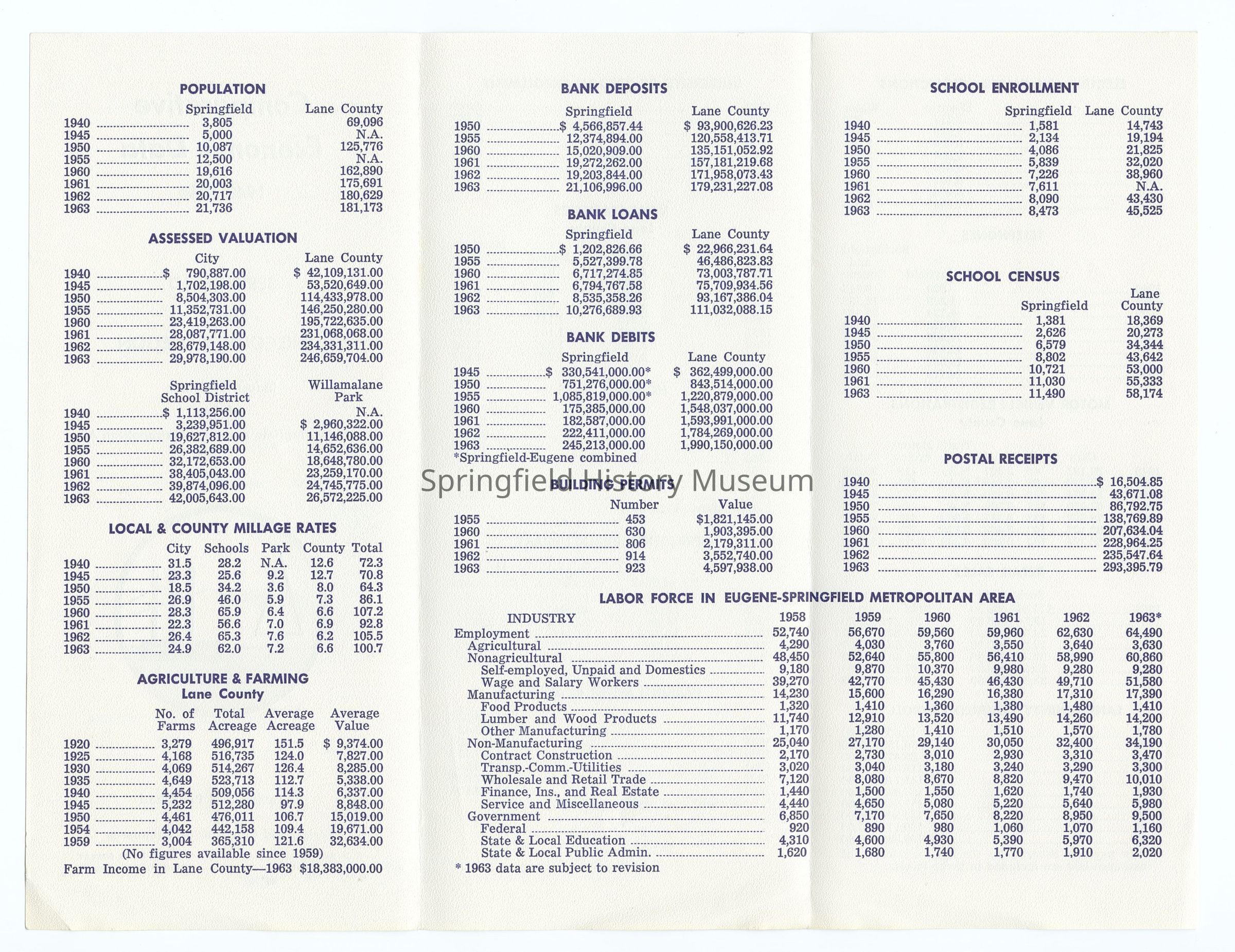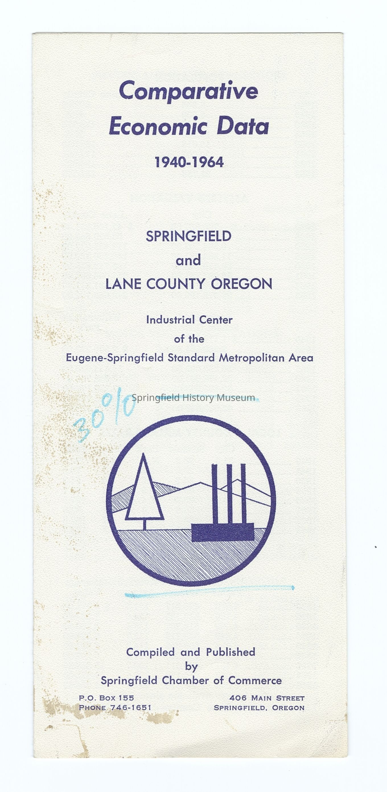 3-panel folded brochure, titled "Comparative Economic Data 1940-1964, Springfield and Lane County, Industrial Center of the Eugene-Springfield Standard Metropolitan Area". Compiled by Springfield Chamber of Commerce. White brochure.Context