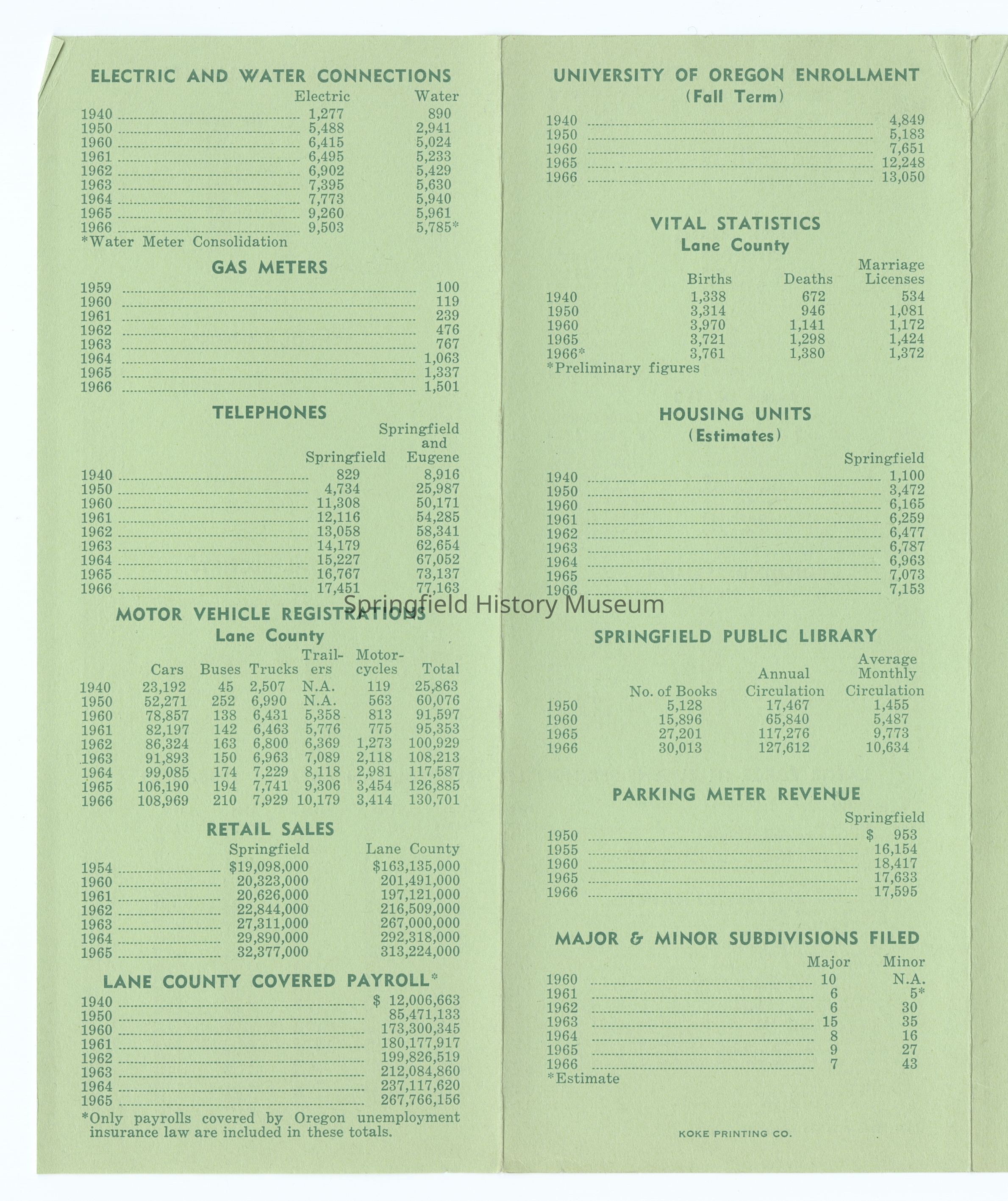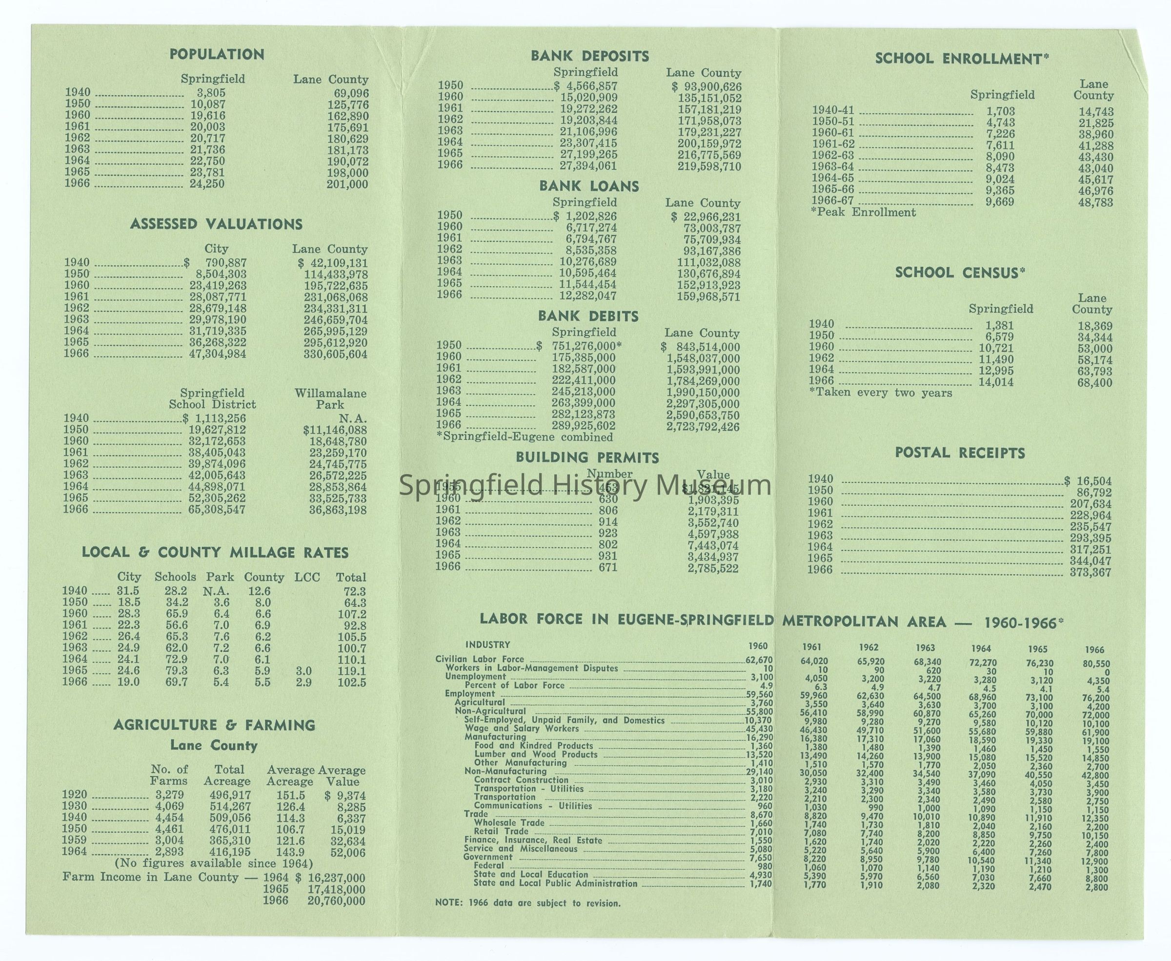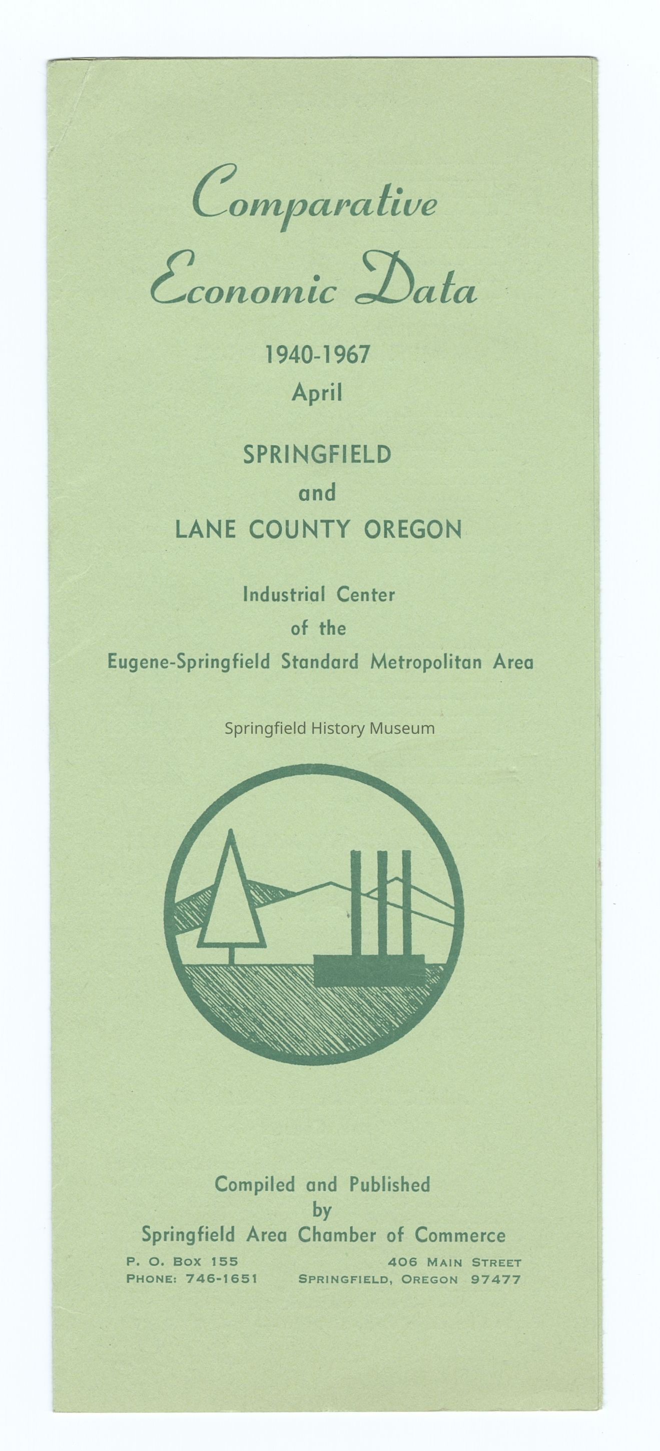 3-panel folded brochure, titled "Comparative Economic Data 1940-1967, Springfield and Lane County, Industrial Center of the Eugene-Springfield Standard Metropolitan Area". Compiled by Springfield Chamber of Commerce. Green brochure.Context