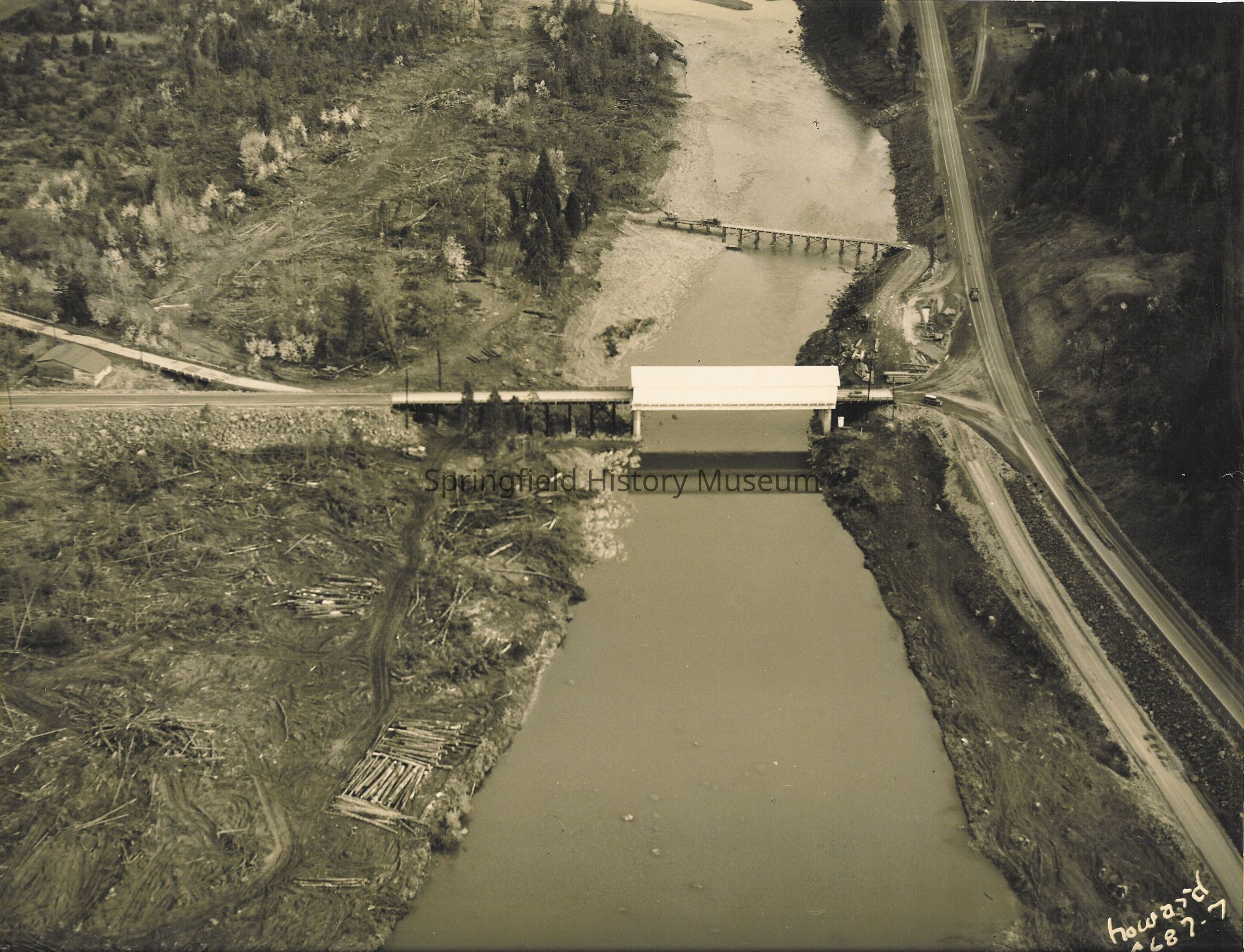 Aerial view of covered bridge over Willamette River from Highway 58 to Lowell before construction of Lookout and Dexter dams. Undated. Marked "Howard C687-7"