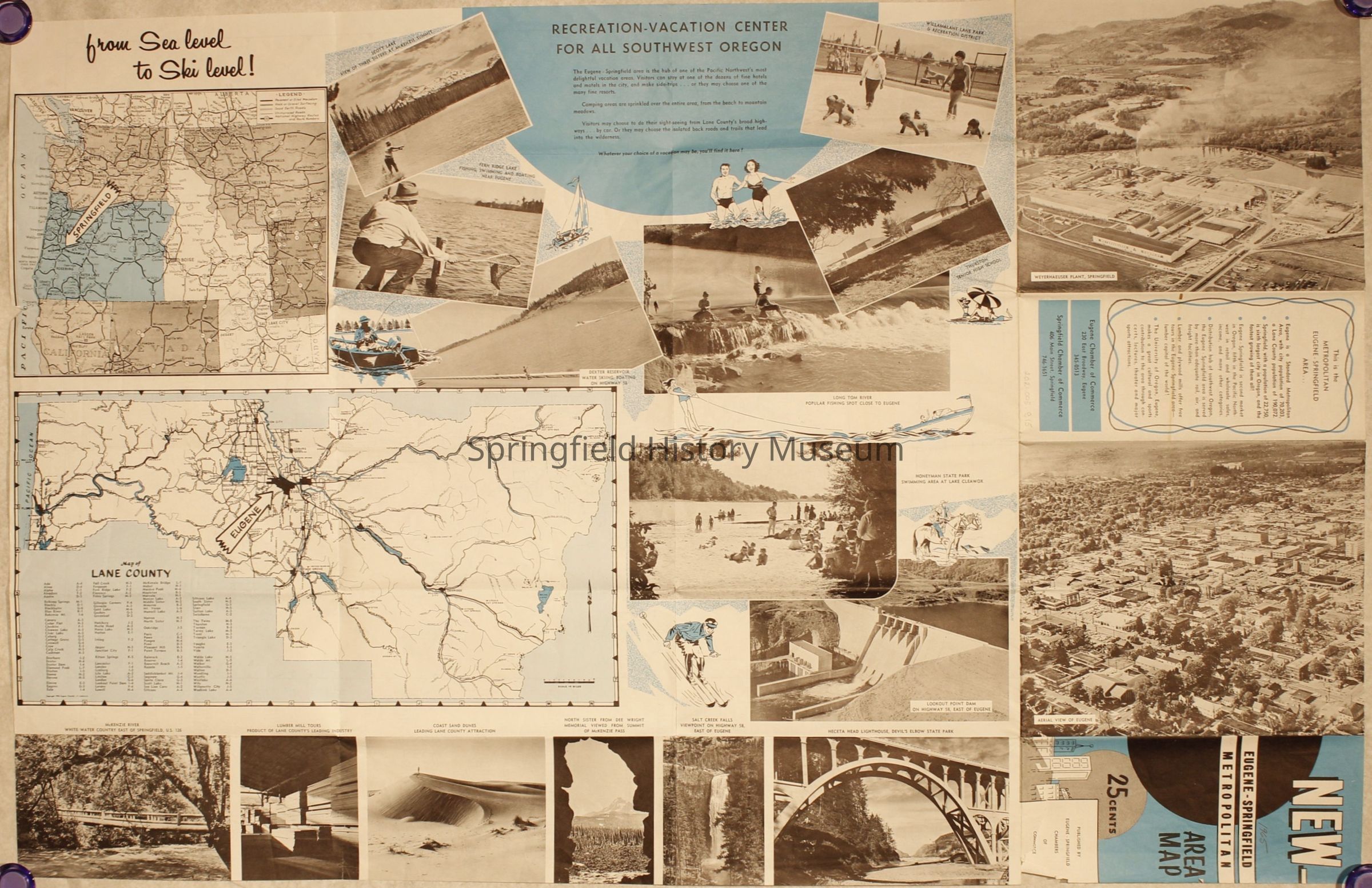 Map of Metropolitan Eugene and Springfield, 1965. Has basic facts and photographs about Springfield and Eugene.Context