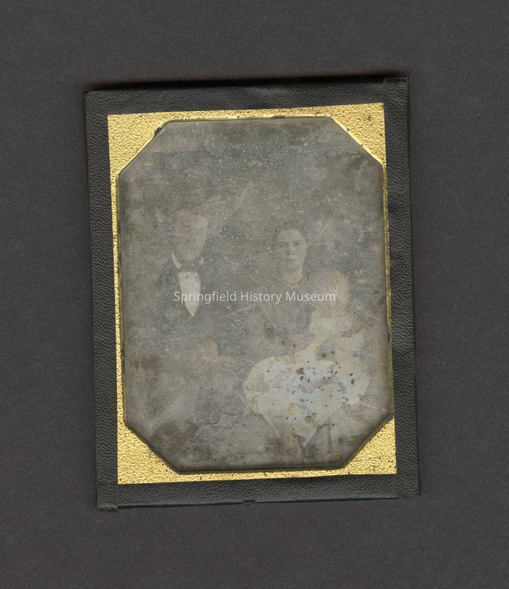 Amos and Lydia Moxley with infant son, Joseph. Dated 1849. Case is 3.325 x 4.25 inches, black paper backing and gold metal trim over glass. Scanned 300 ppi, tif format,