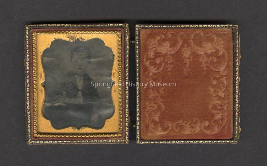 Young boy, seated, folding frame made of wood or cardboard with a paper cover. Front has an urn of flowers, inside has faded red velvet pad.