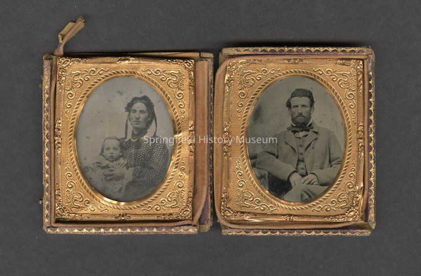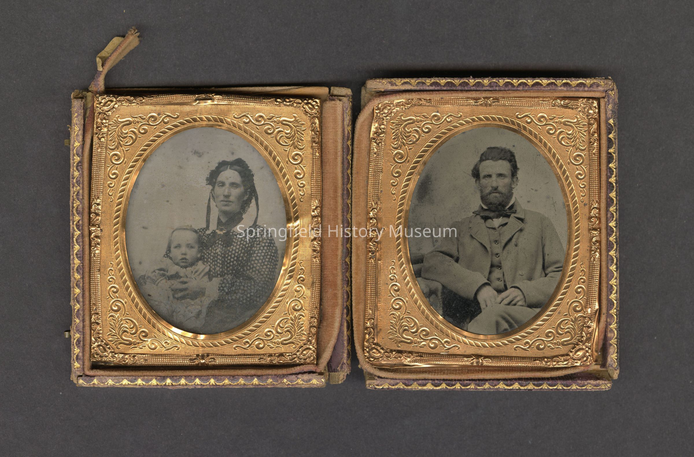 Two tintypes of the Day family, both set in gold tone foil frames inside a folding book frame. Adelia Harlow Day and son Harry Day on left; George B. Day pictured opposite.