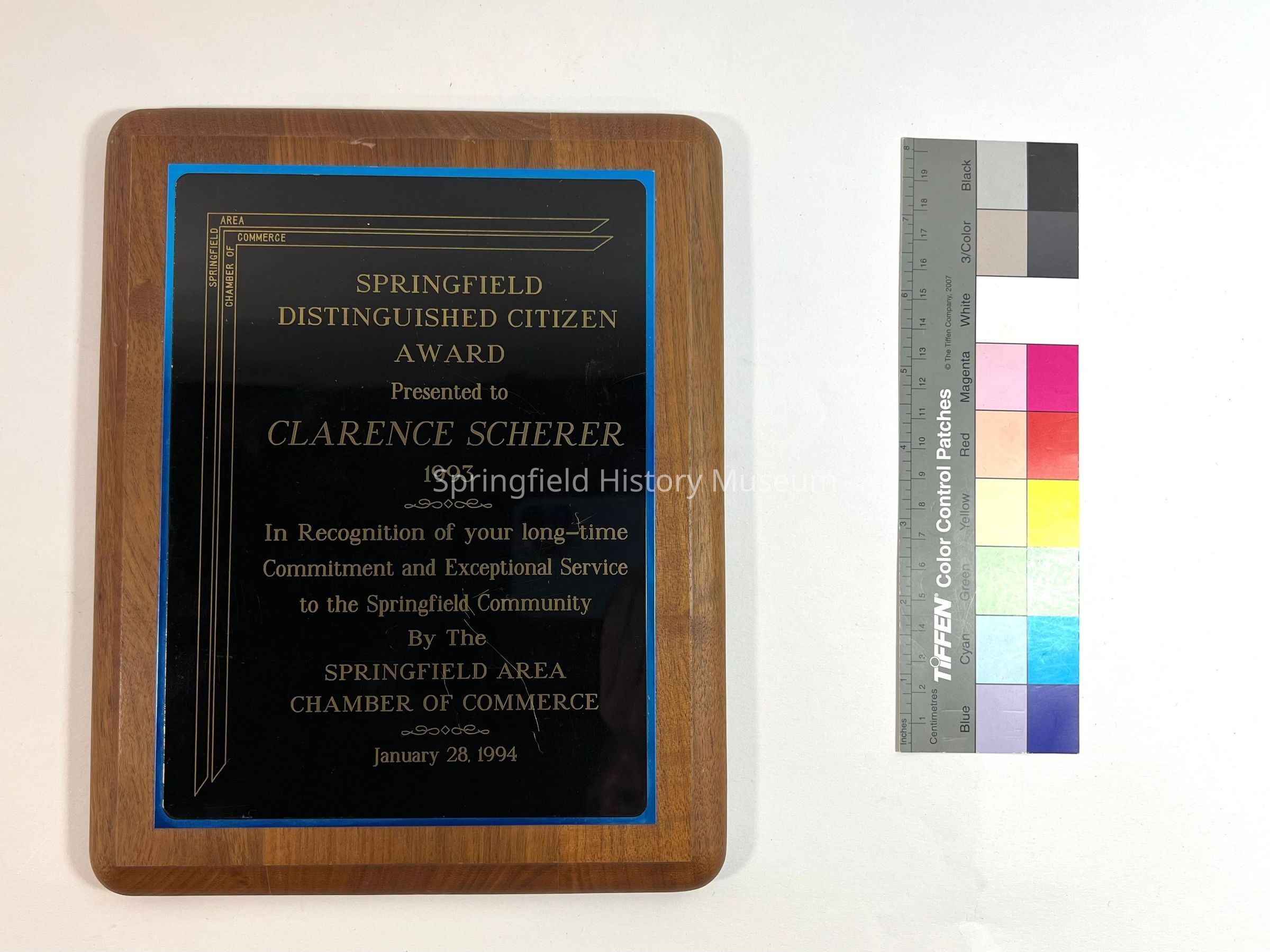 Springfield Chamber of Commerce Distinguished Citizen Award, presented to Clarence Scherer on January 28, 1993 (awarded in 1994)Collection