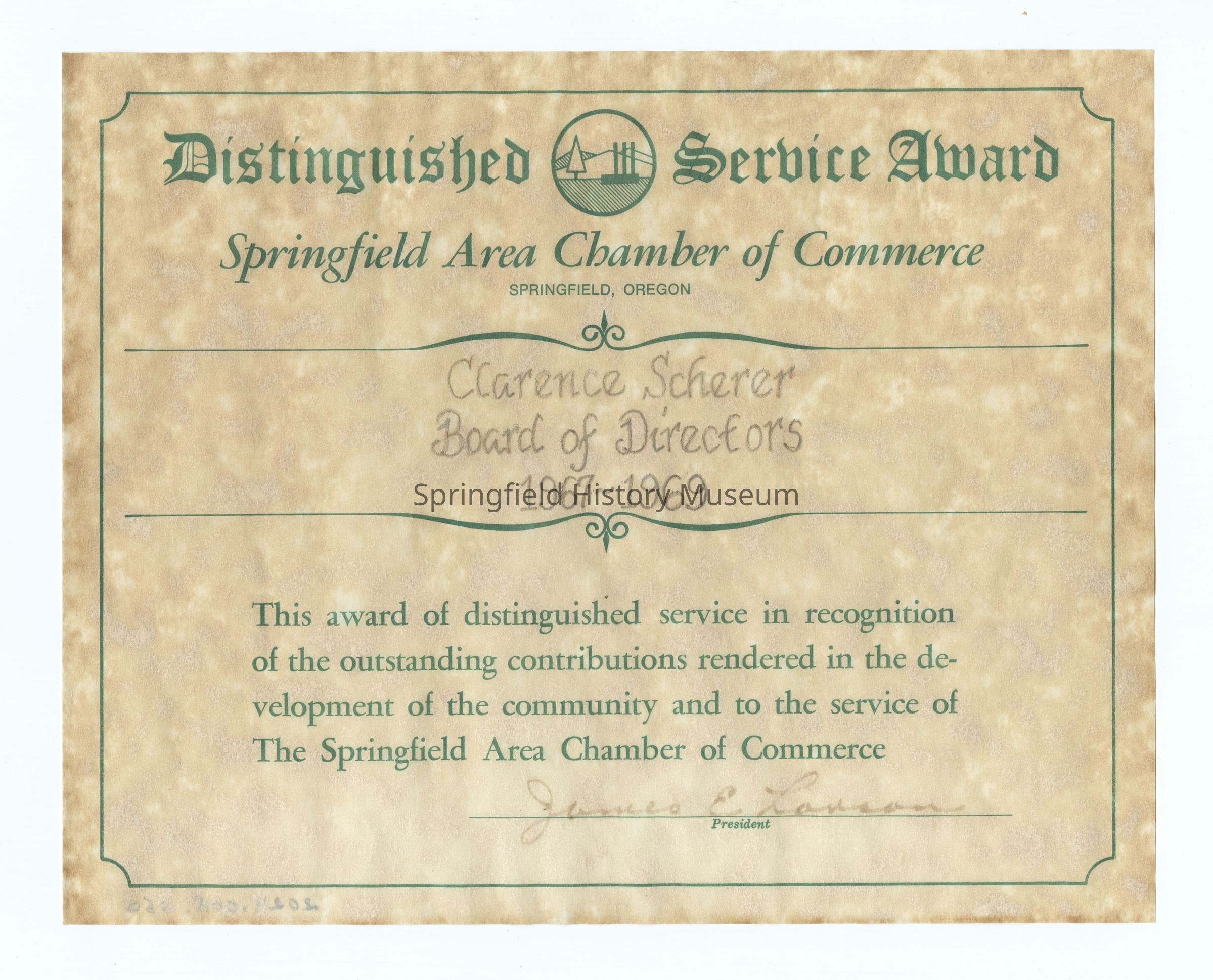 Distinguished Service Award, Springfield Chamber of Commerce to Clarence Scherer, 1967-1969Collection