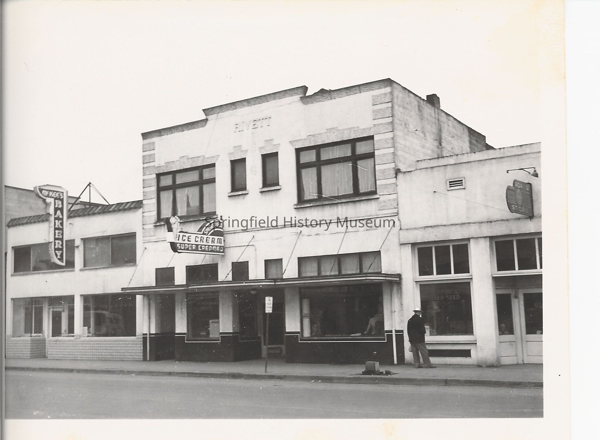 Springfield Super Creamed Ice cream shop next to McKees Bakery with a man on right side of building. Between Fourth and Fifth Street on Main.