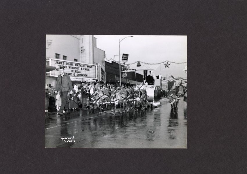 Photograph of a Christmas Parade, Springfield, Oregon, undated. Reindeer pulling a sleigh with Santa Claus.Collection