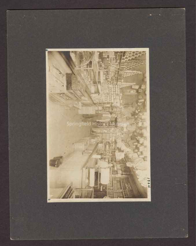 Photograph of the interior of J J Bryan Store, 1904. Photograph is mounted on cardboard. Image is identical to 2017.003.518, but has been dated "1904" in upper right corner, and "J.J. Bryan store 1904" written on back in pencil.