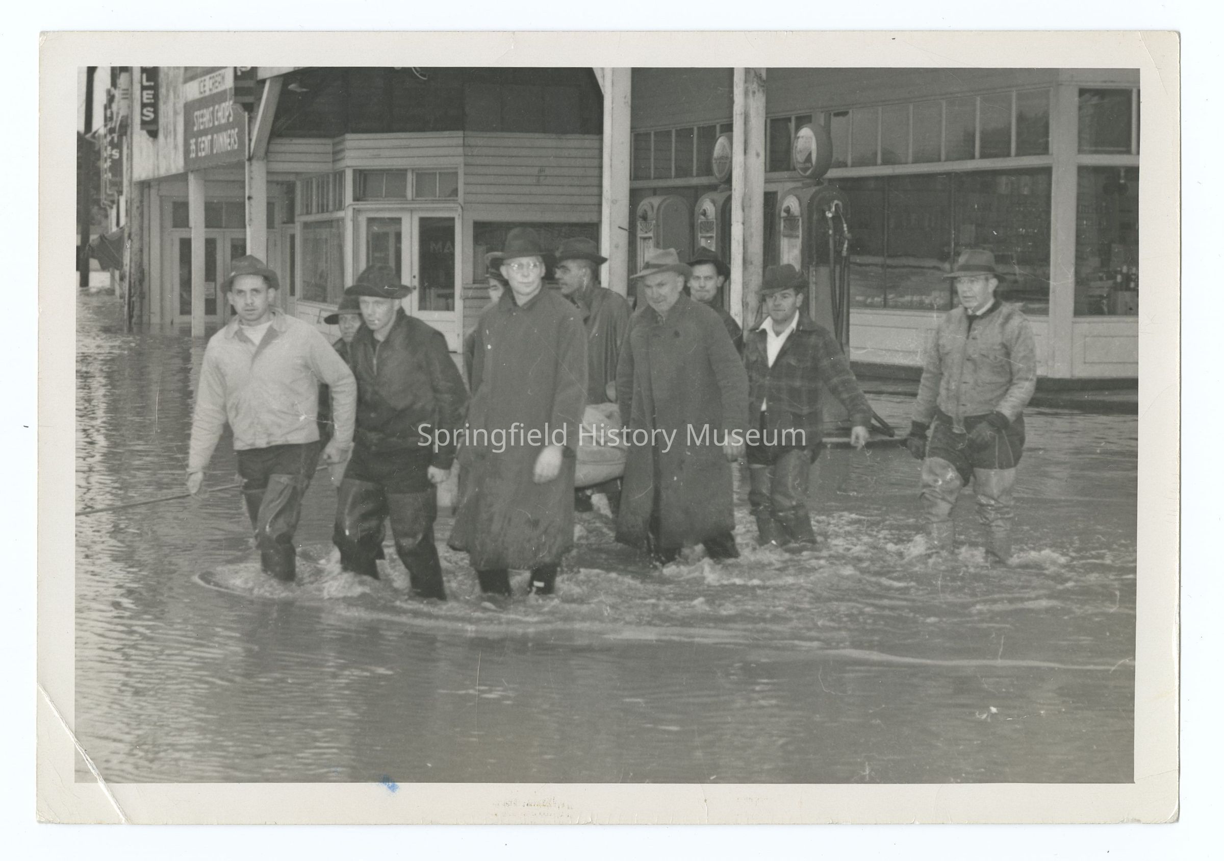 Photograph of high water in Springfield, shows people in a flooded street in front of a gas station, 1943Photograph Details