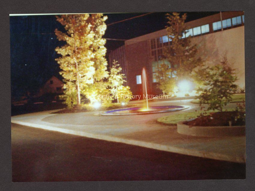 Color photograph of fountain at night that used to be next to Ramsey Waite (4258 Franklin Blvd, now Trak Powersports) on Franklin Blvd (building in background is hot rod shop), sometime in mid 1960s.Collection