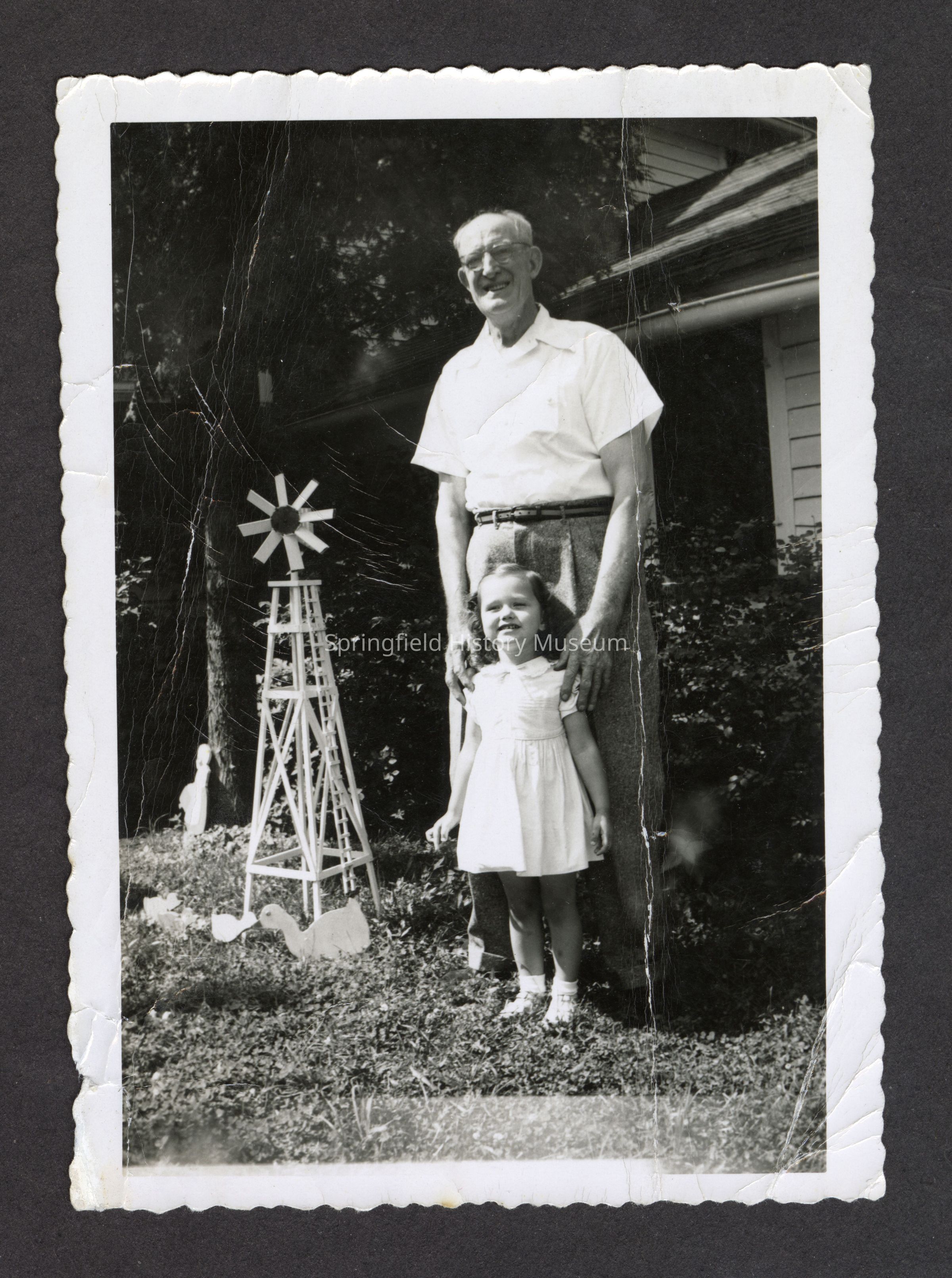 Photograph of a young girl and a man in a yard, beside a small decorative windmill. Same young girl in 2003.055.054. Possibly same man in 2003.055.026.