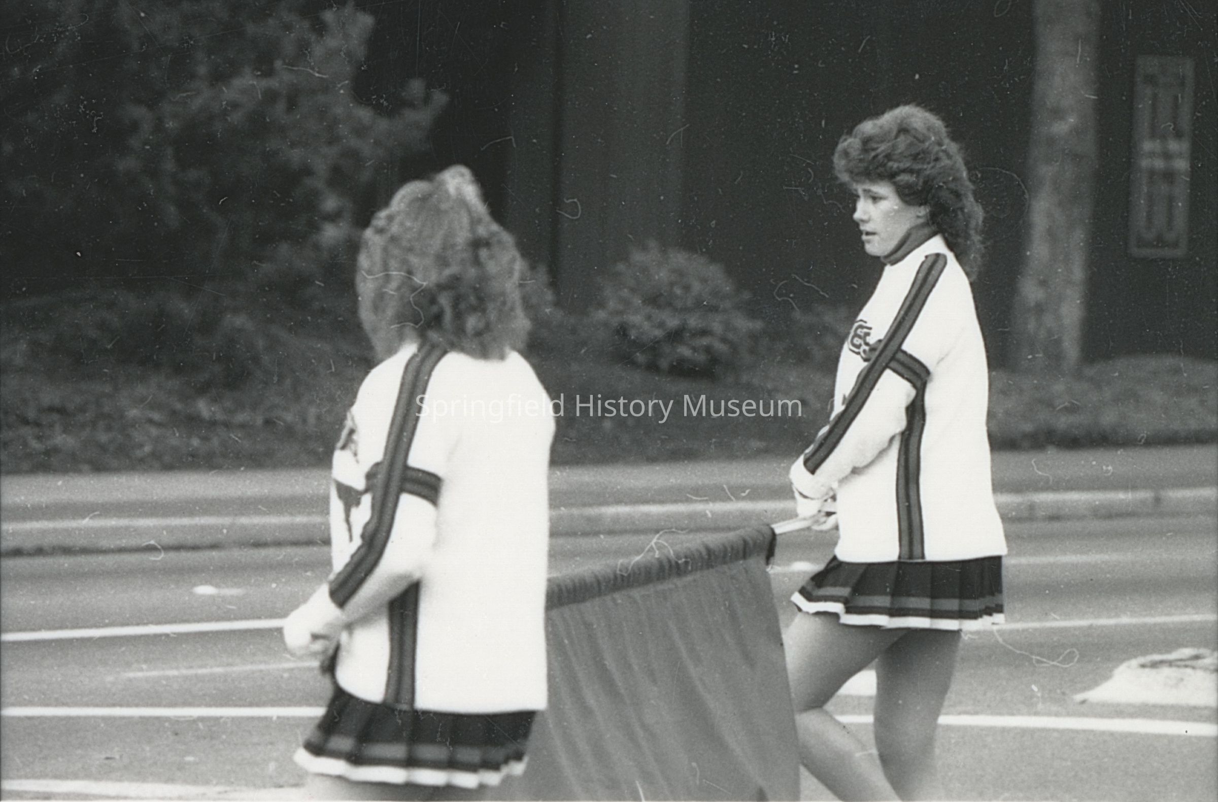 Photograph overview of a Christmas parade, Springfield, circa 1980, undated. Shows: Spectators, Children, Prize winning float, Thurston High School Cheerleaders.