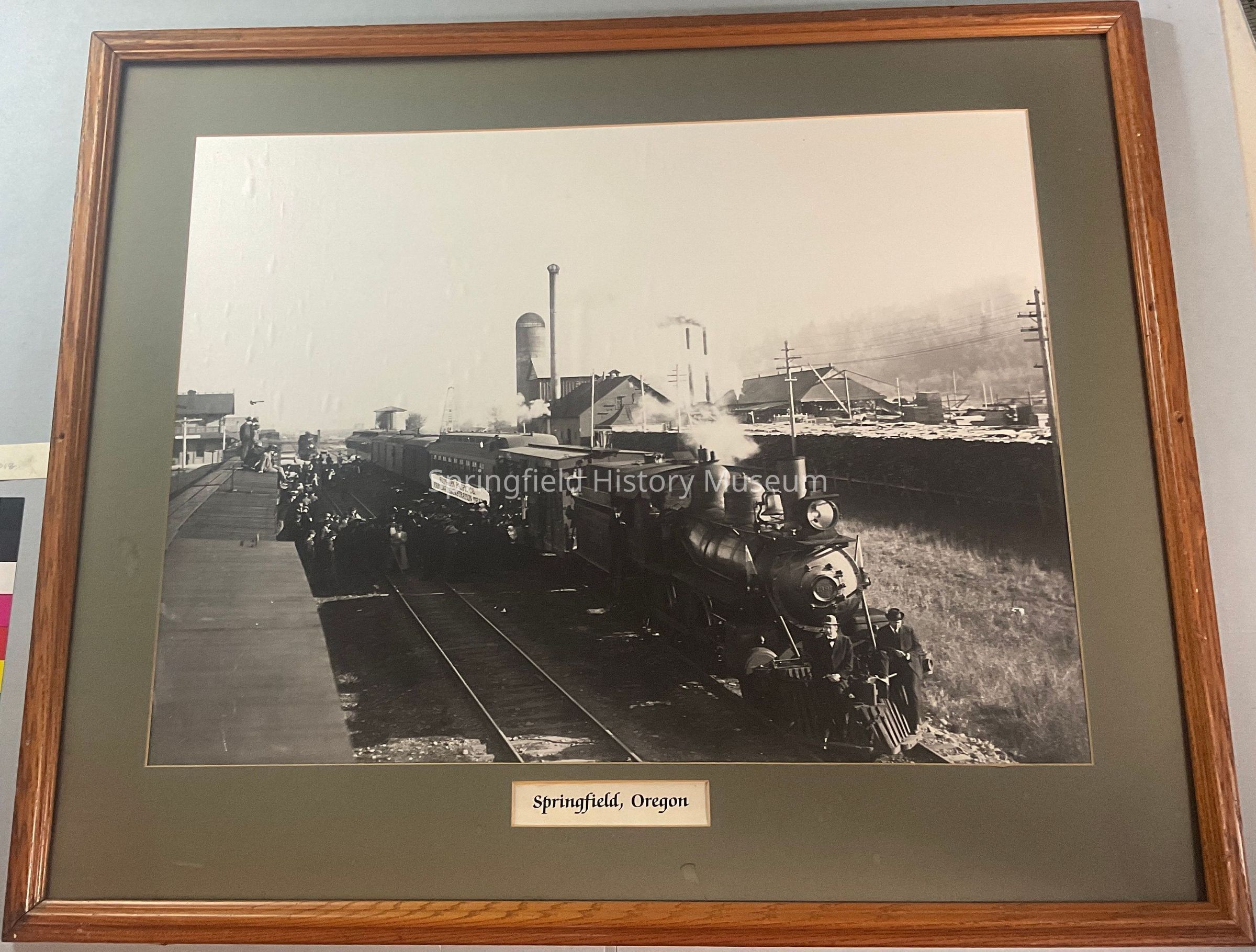 Framed photograph of train in Springfield, 1910. A sign on the train says Southern Pacific Co. Farming Demonstration Train.