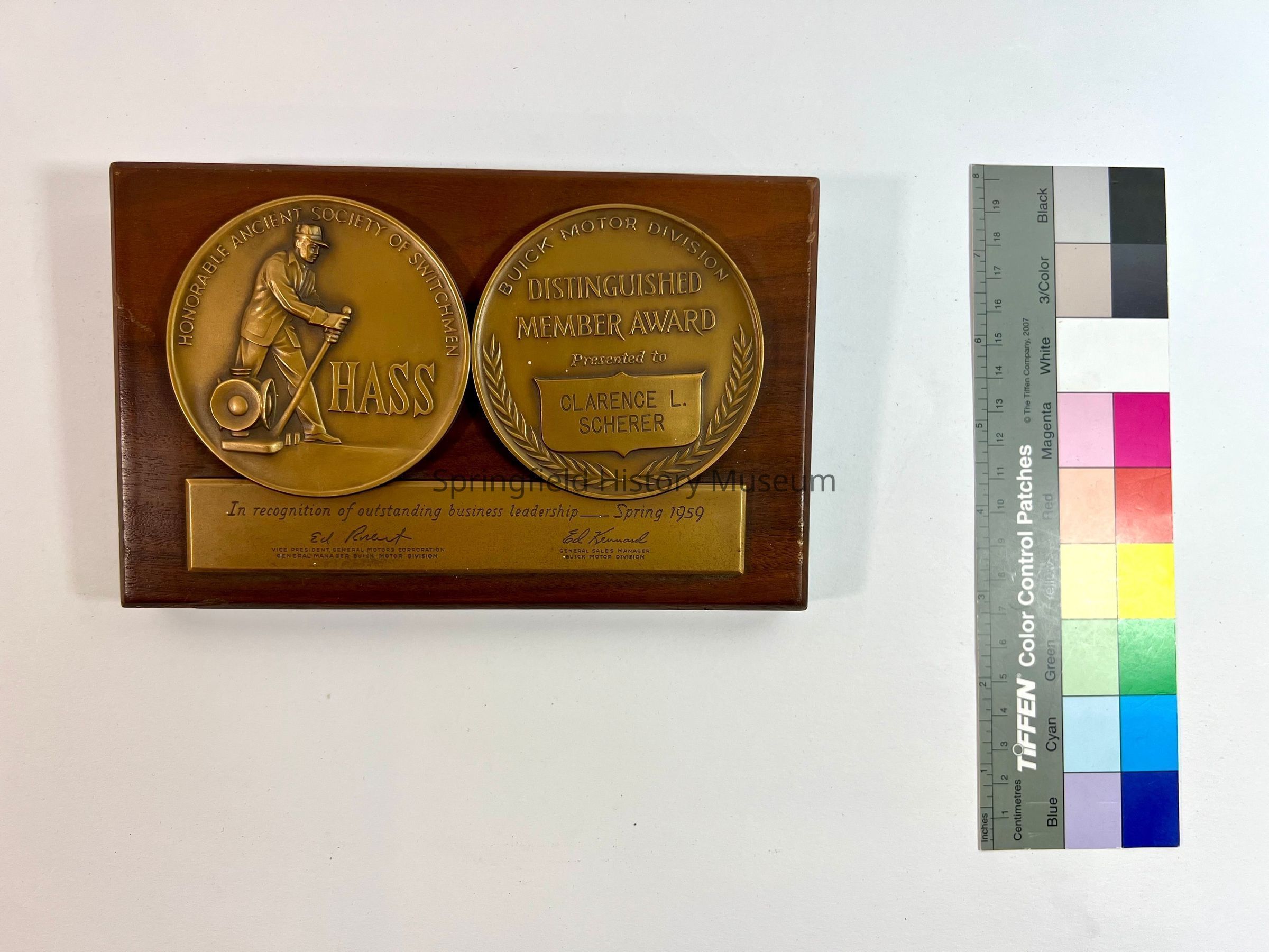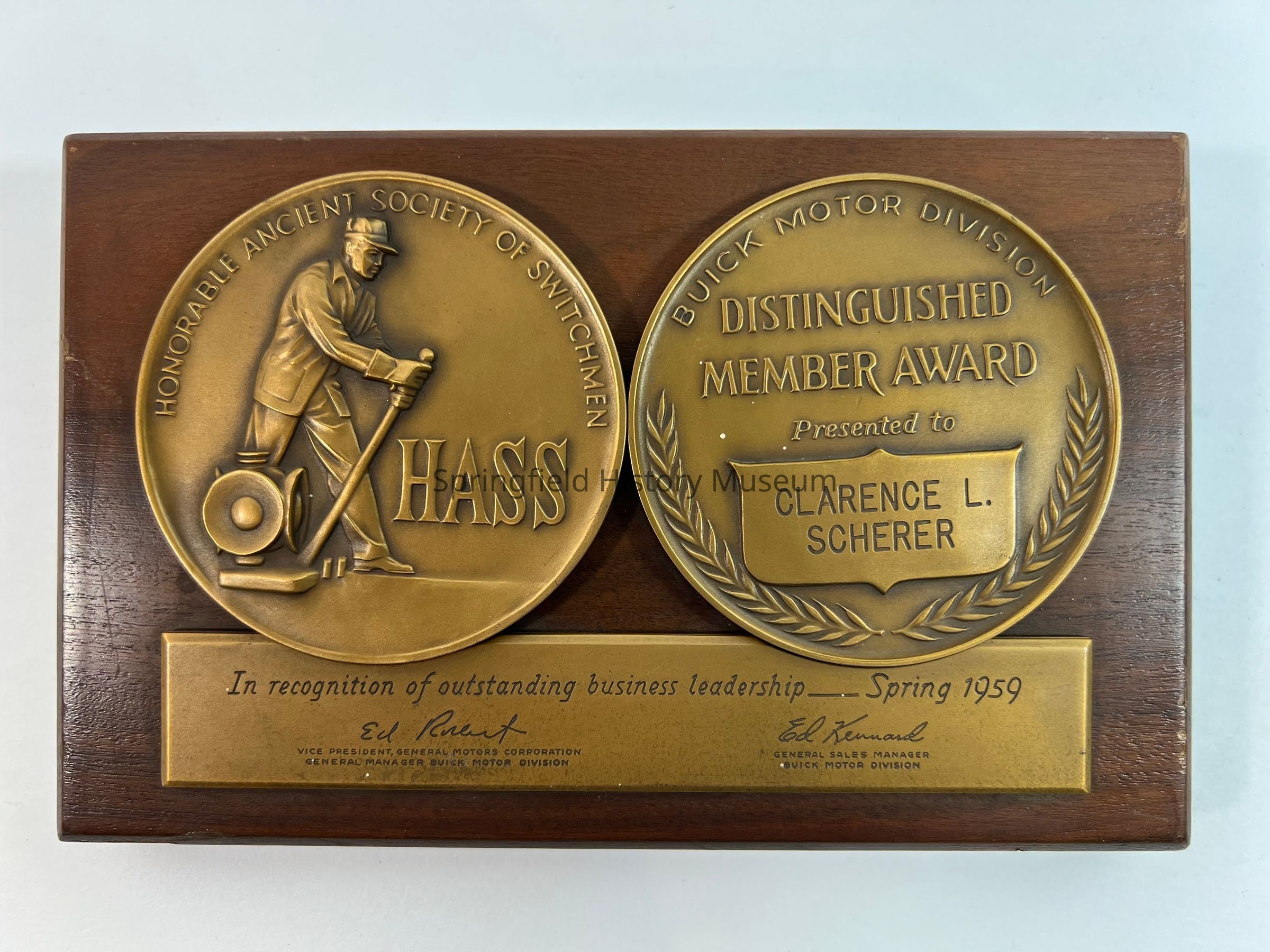 Hass (Honorable Ancient Society of Switchmen) Distinguished Member Award given to Clarence Scherer in Spring 1959 for "Outstanding Business Leadership"Collection