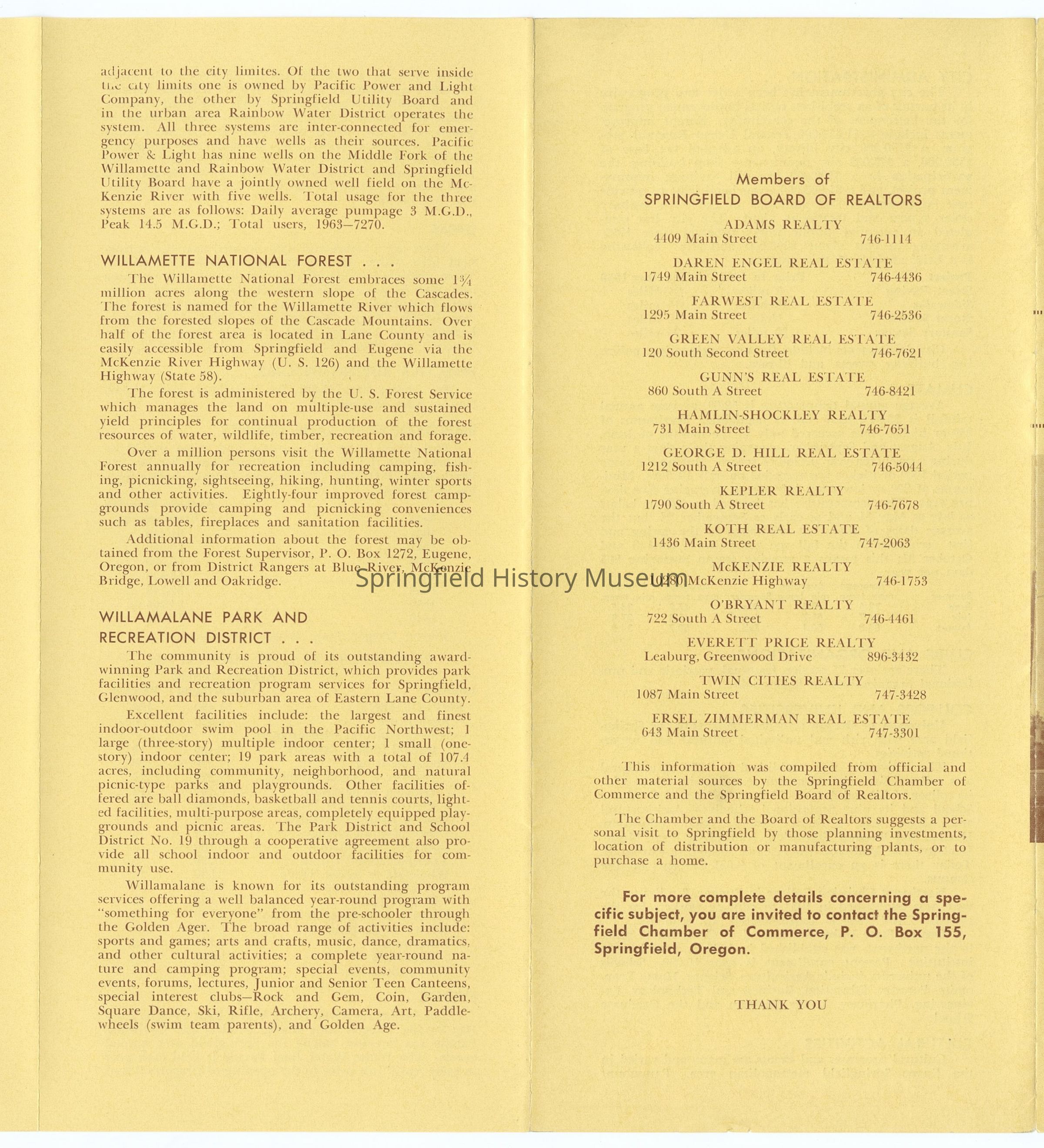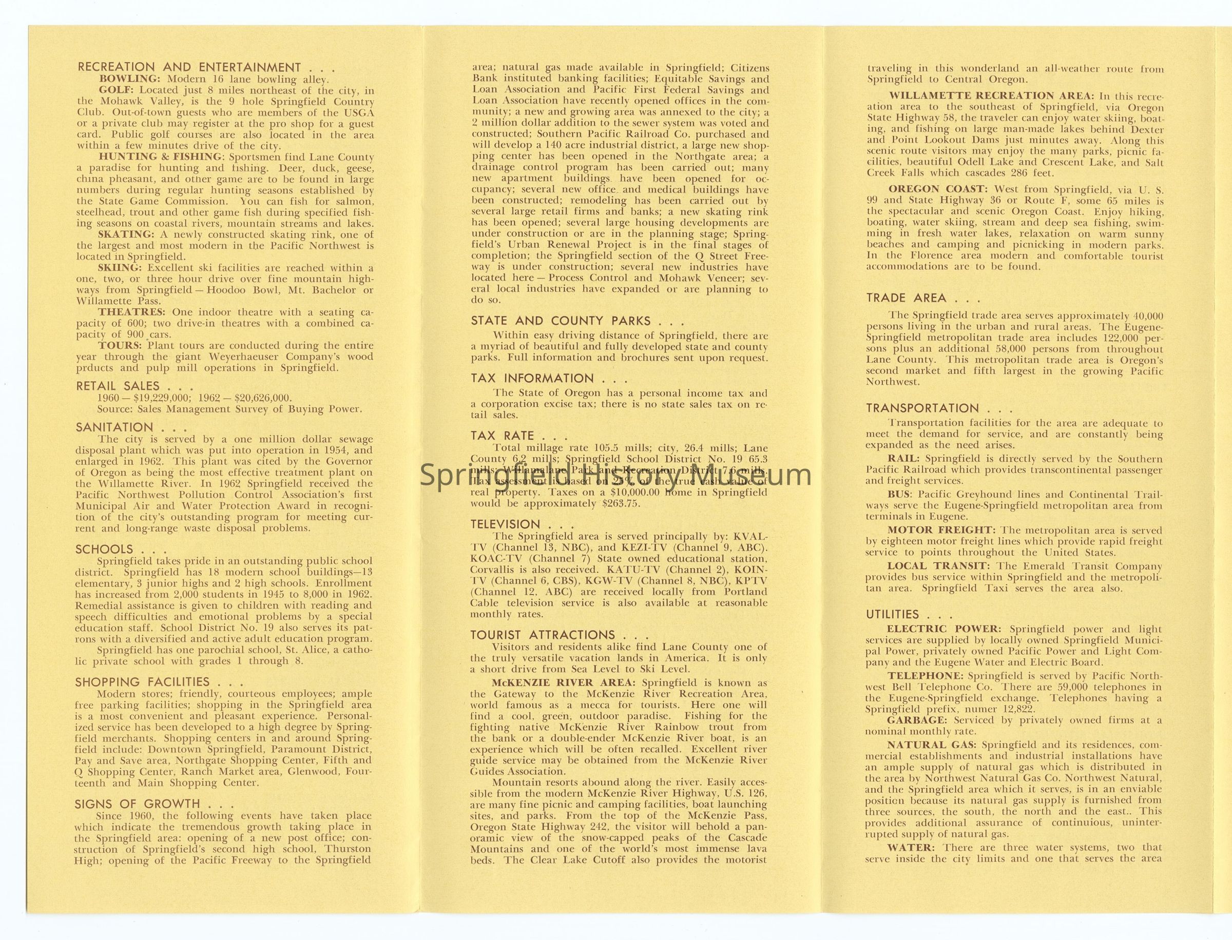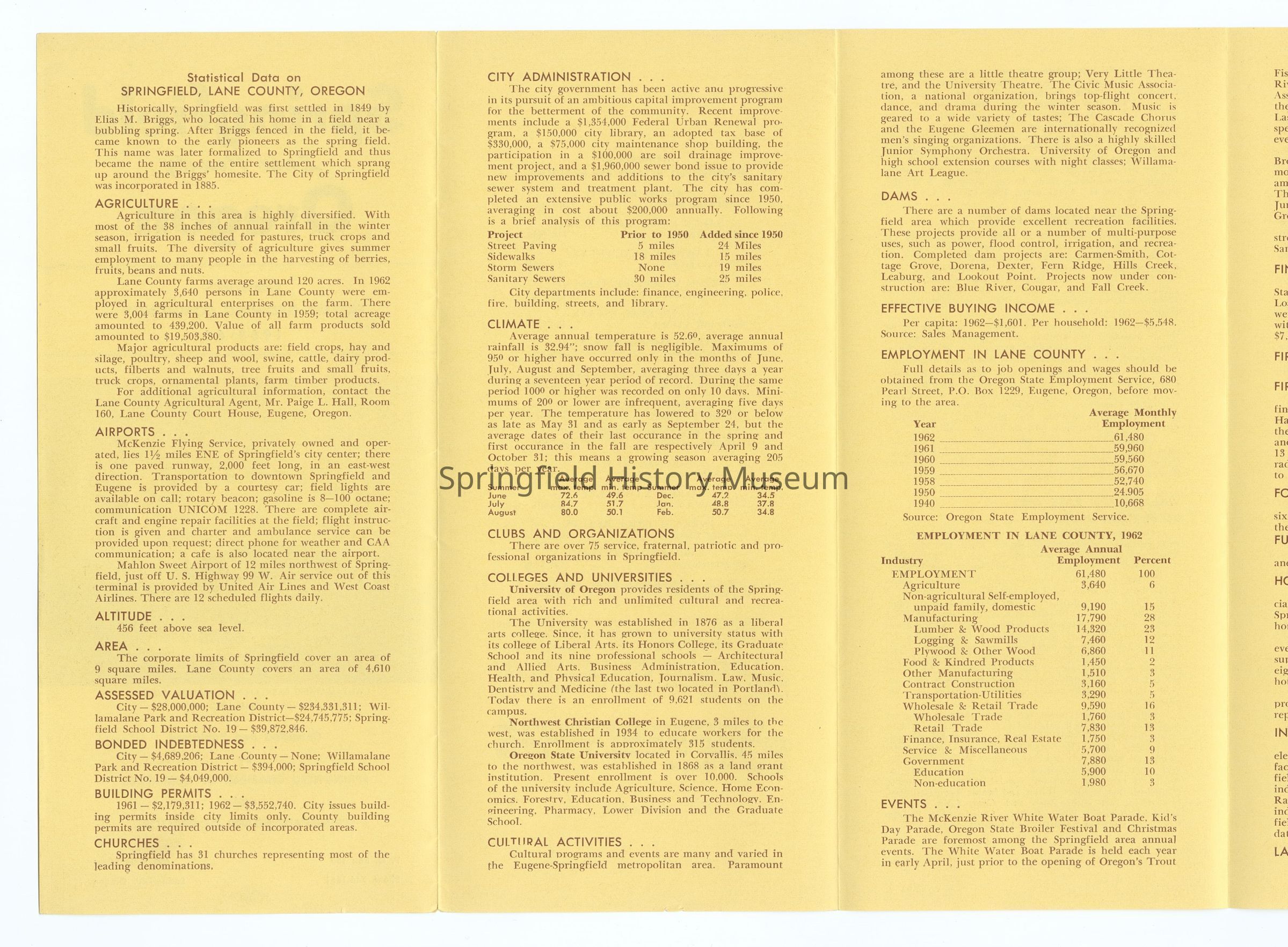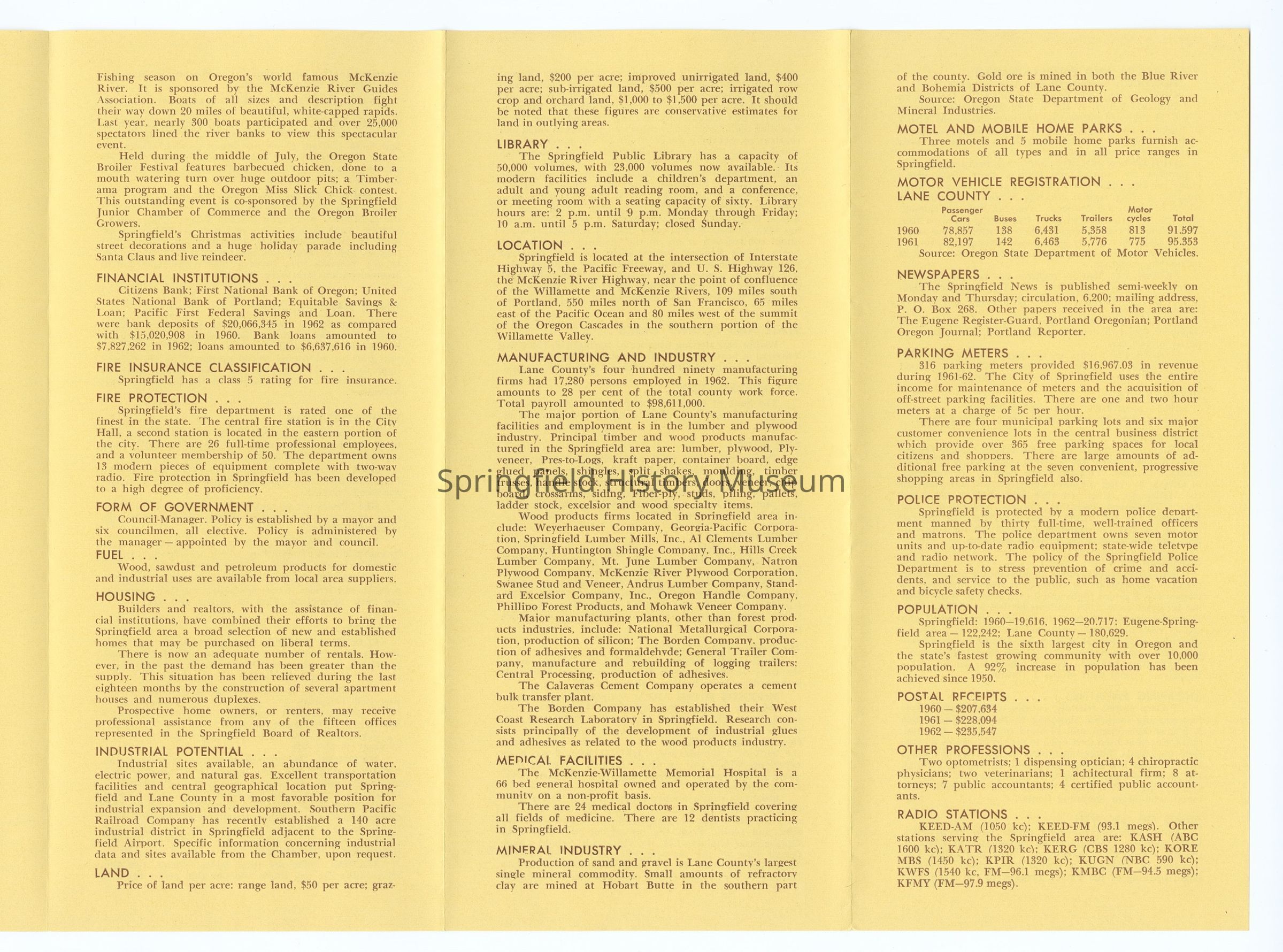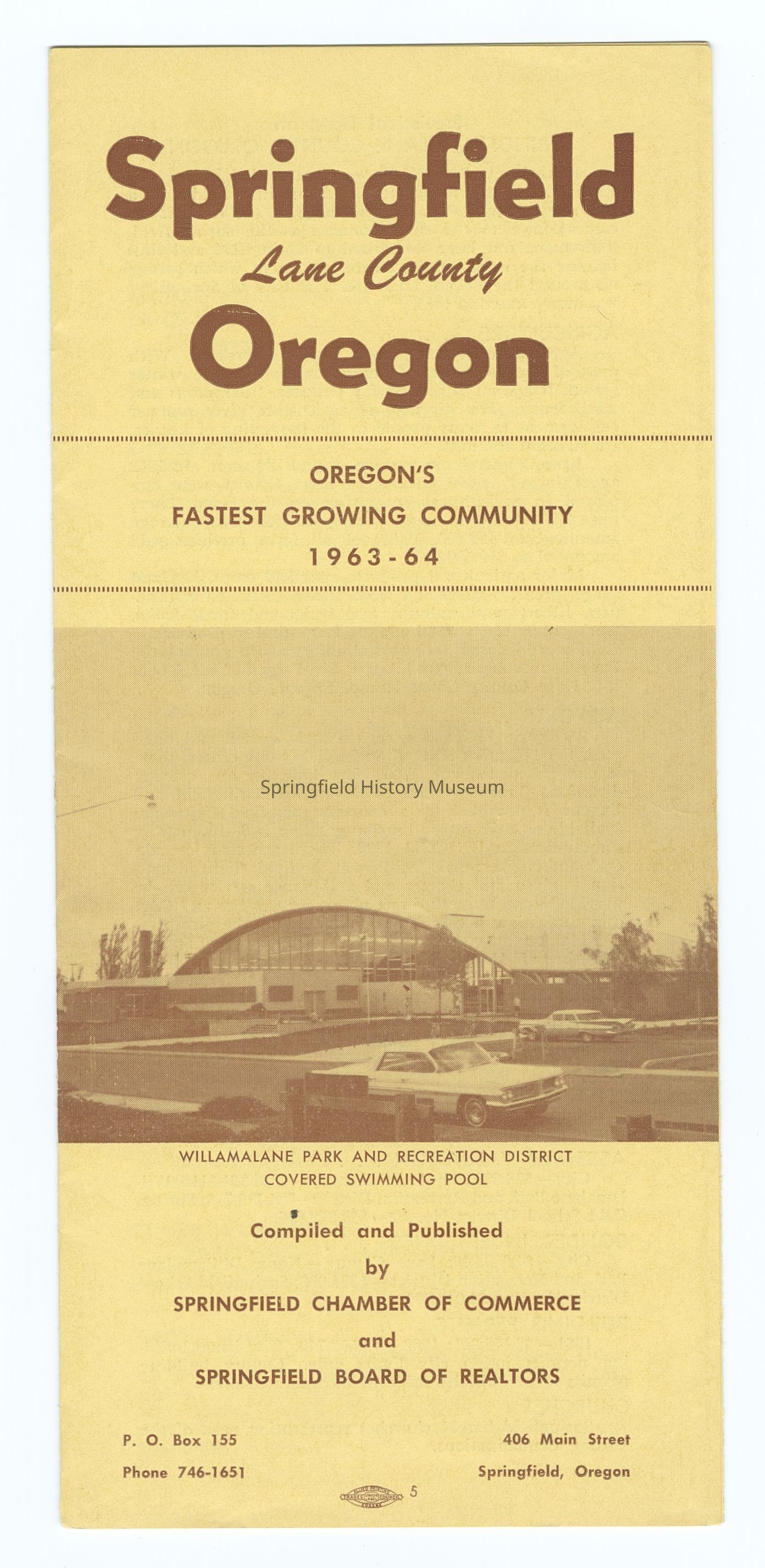 6-panel folded informational brochure titled "Oregon's Fastest Growing Community 1963-64", contains statistical data on Springfield. Yellow-toned brochure. Compiled by Springfield Chamber of Commerce and Springfield Board of Realtors.Context