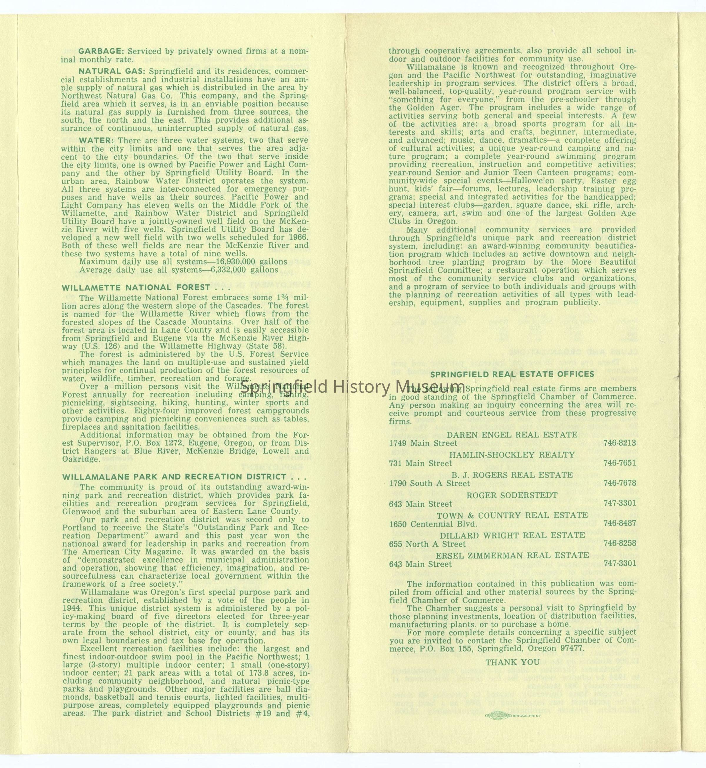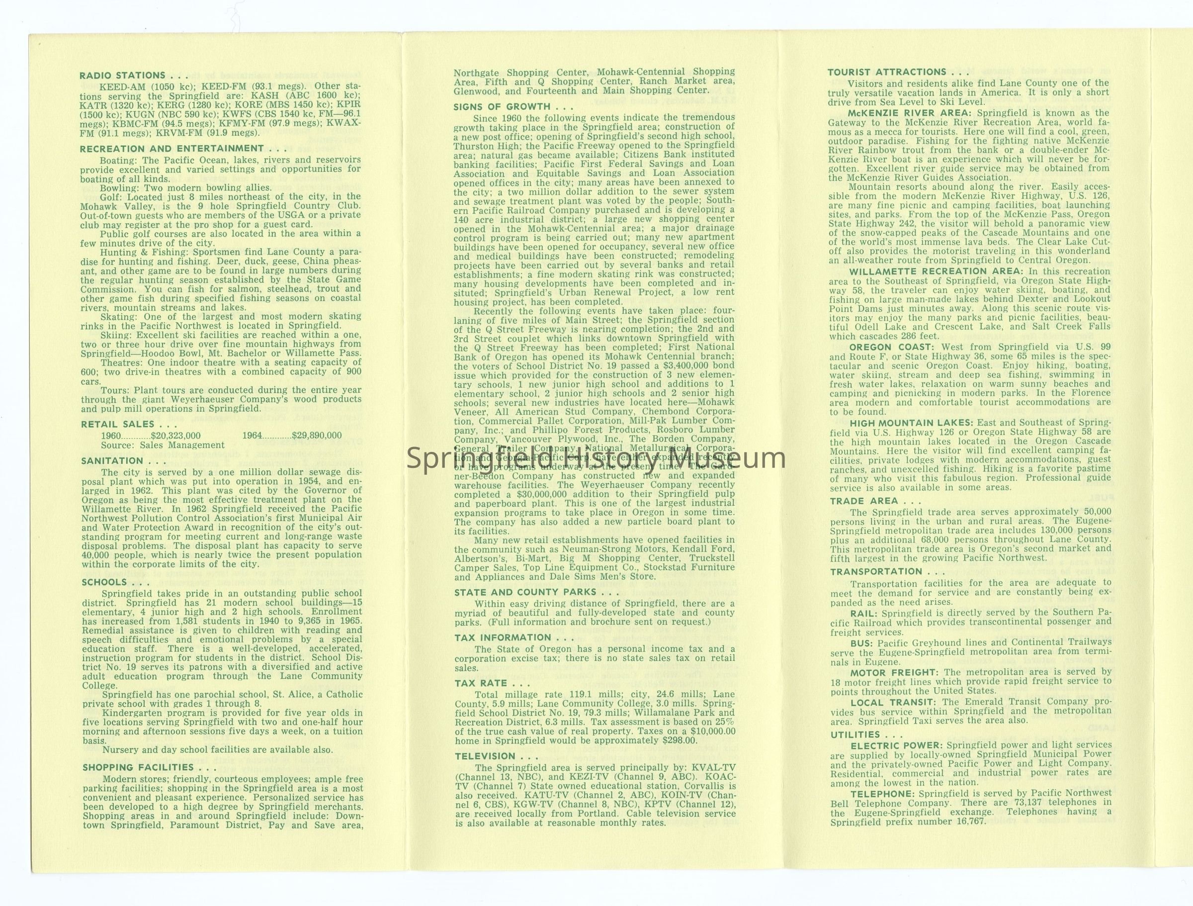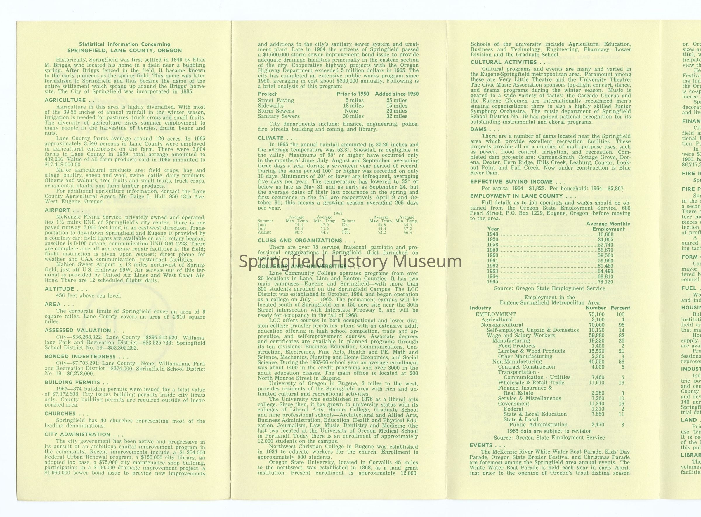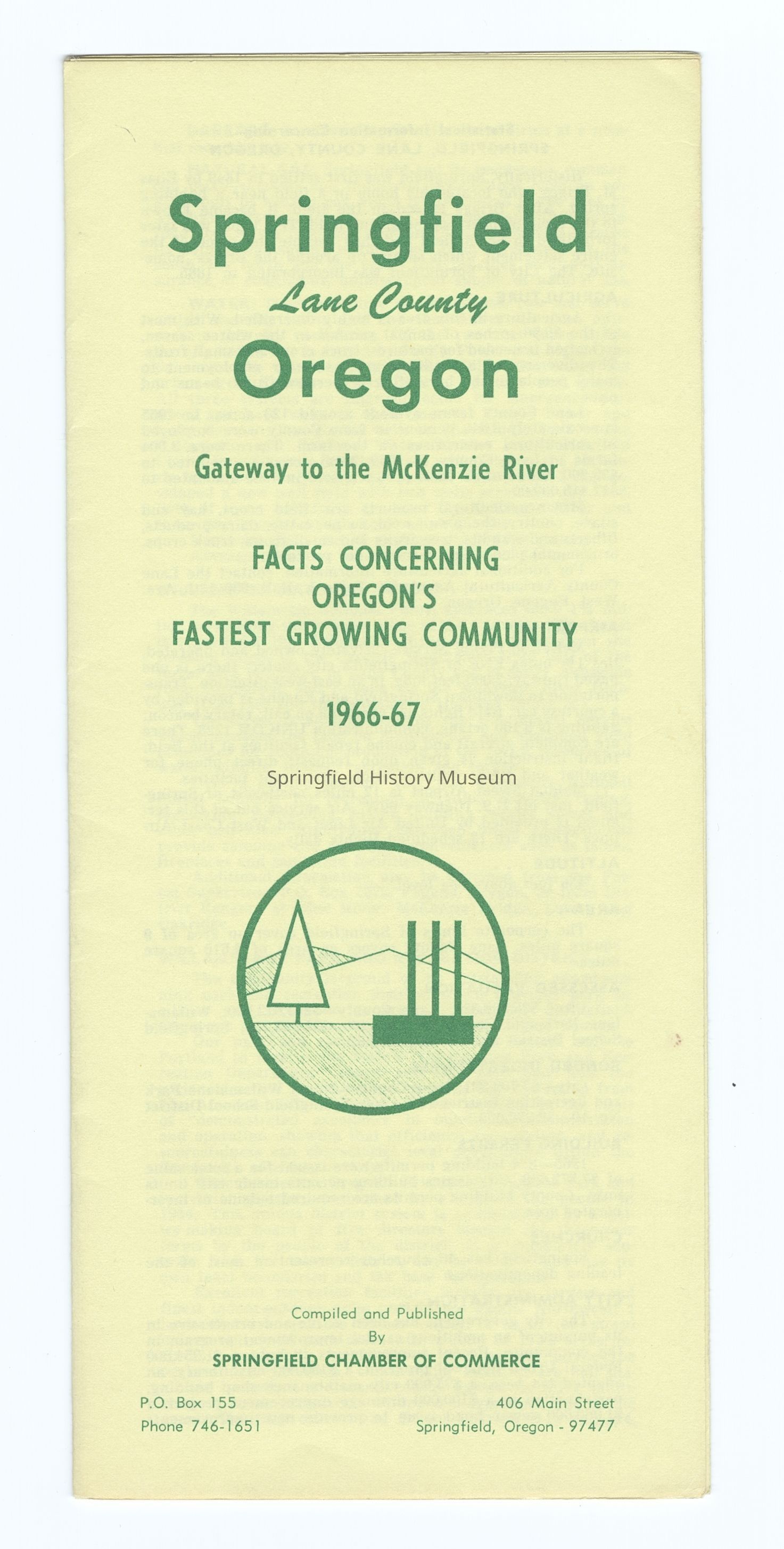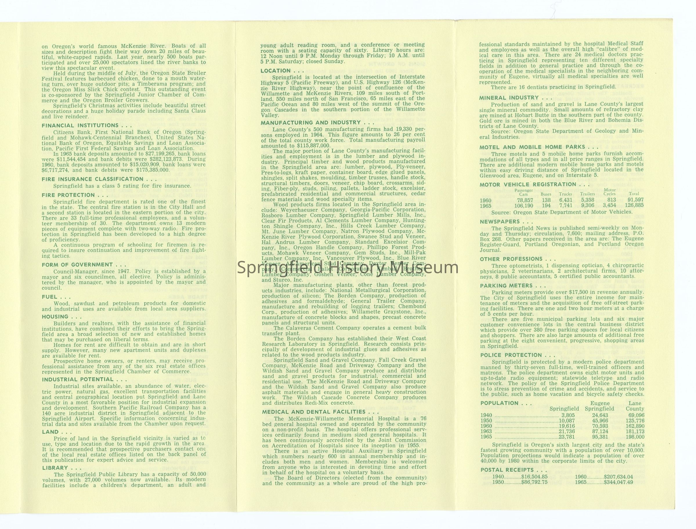 6-panel folded informational brochure titled "Oregon's Fastest Growing Community 1966-67", contains statistical data on Springfield. Yellow brochure with green lettering. Compiled by Springfield Chamber of Commerce.Context