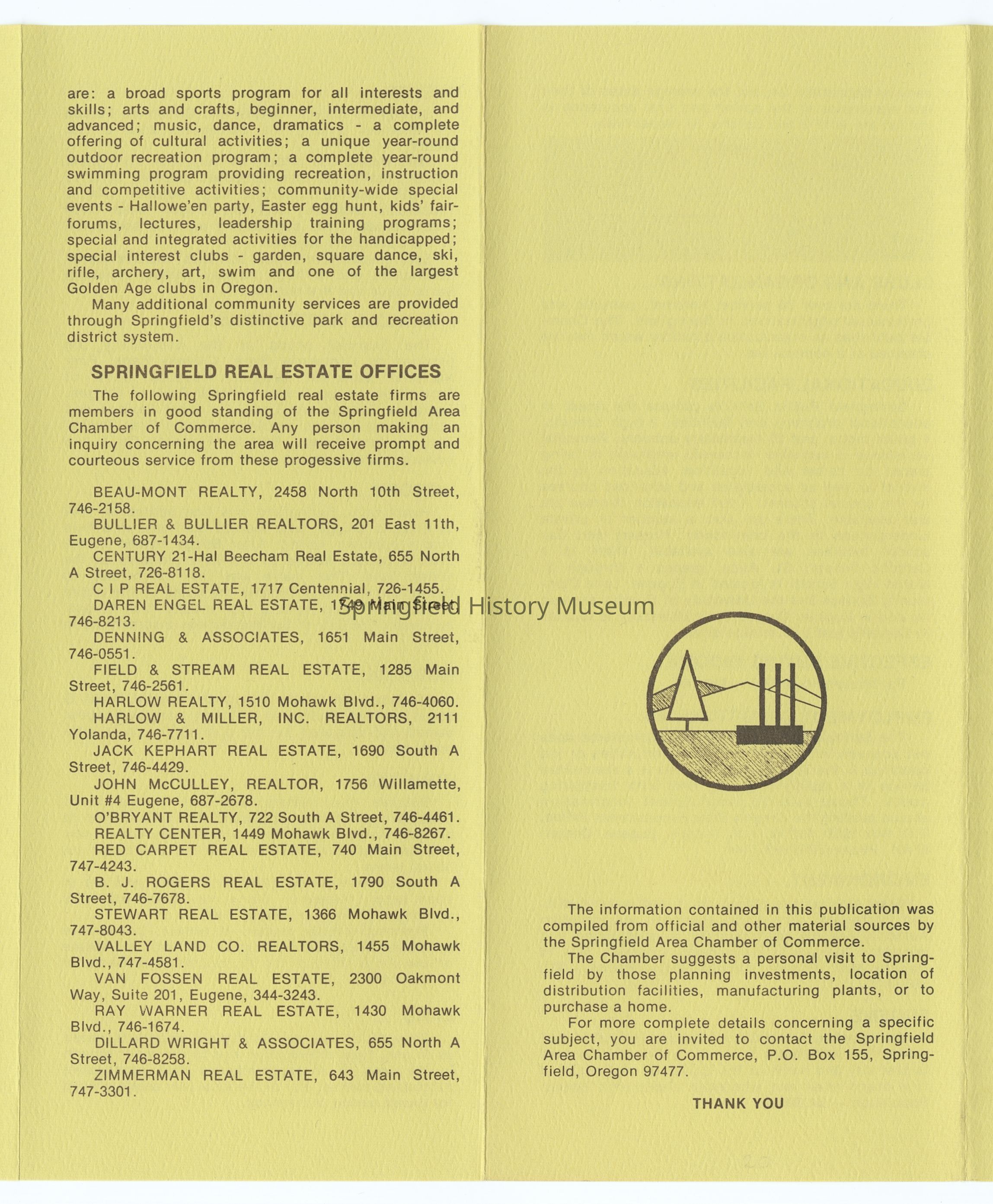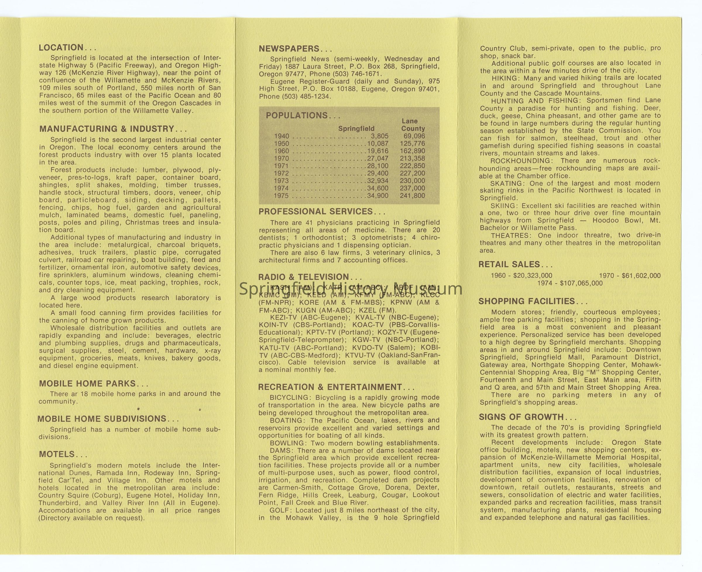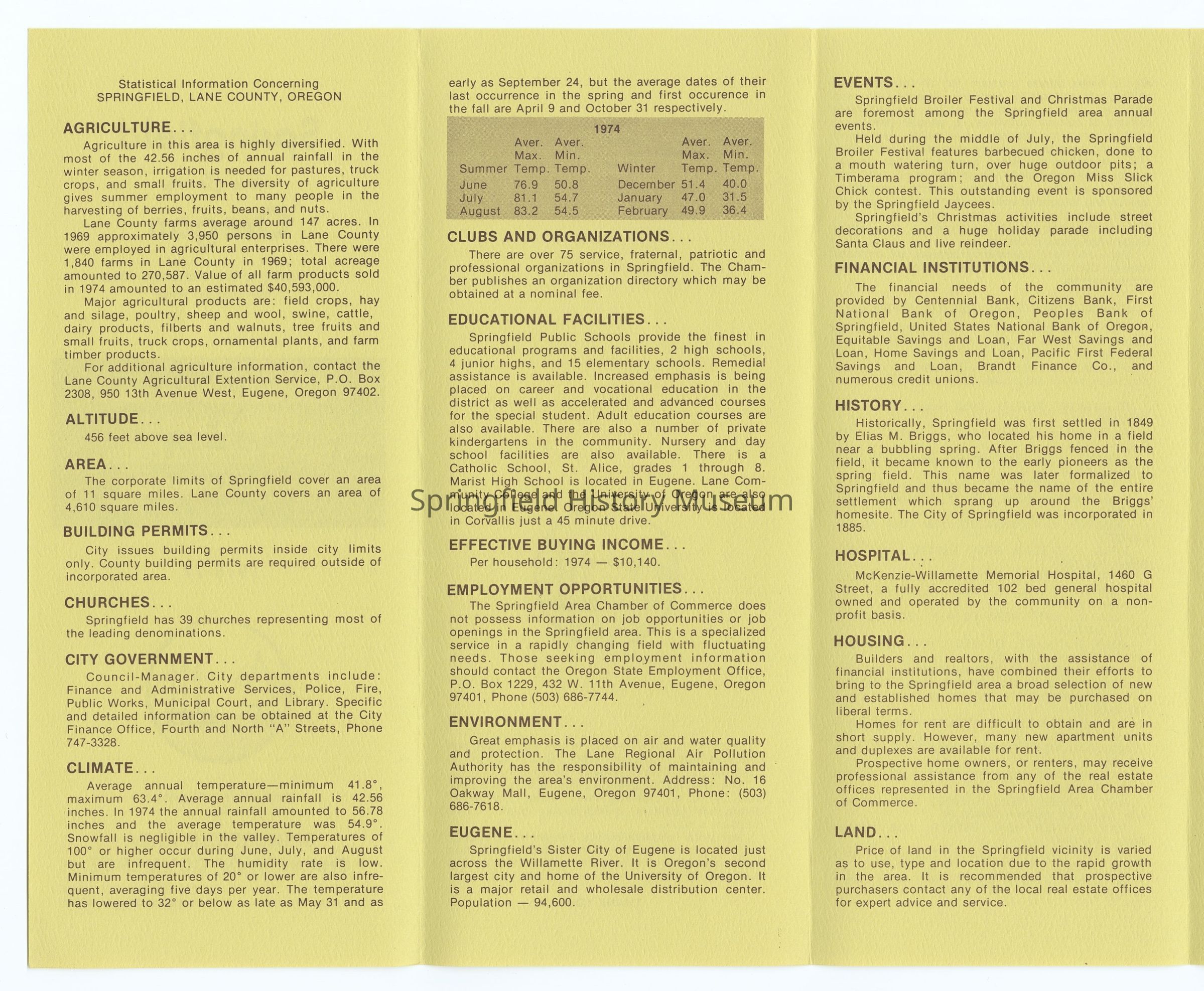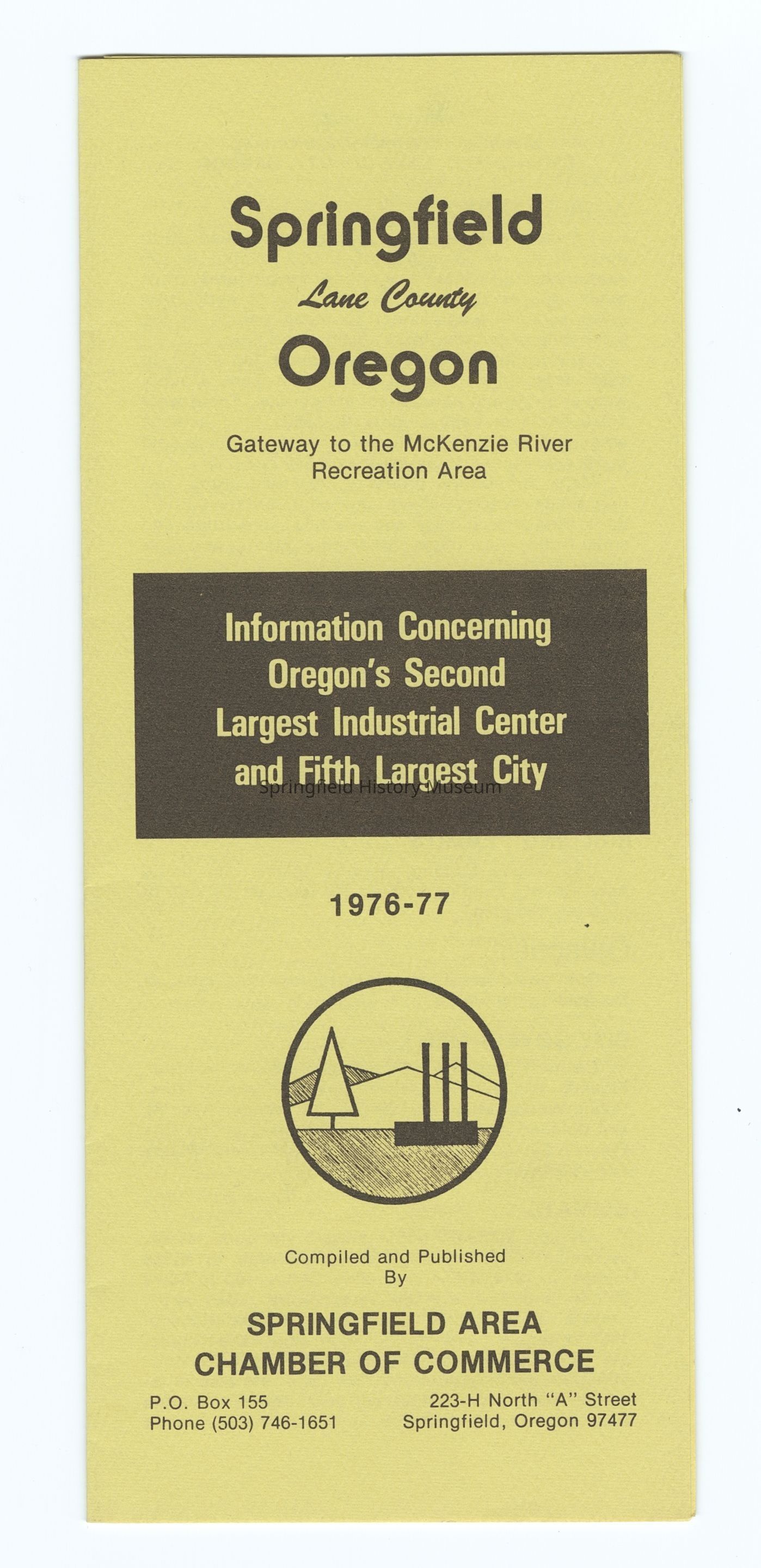 6-panel folded informational brochure titled "Information Concerning Oregon's Second Largest Industrial Center and Fifth Largest City 1976-77", contains statistical data on Springfield. Yellow-toned brochure. Compiled by Springfield Chamber of Commerce.Context