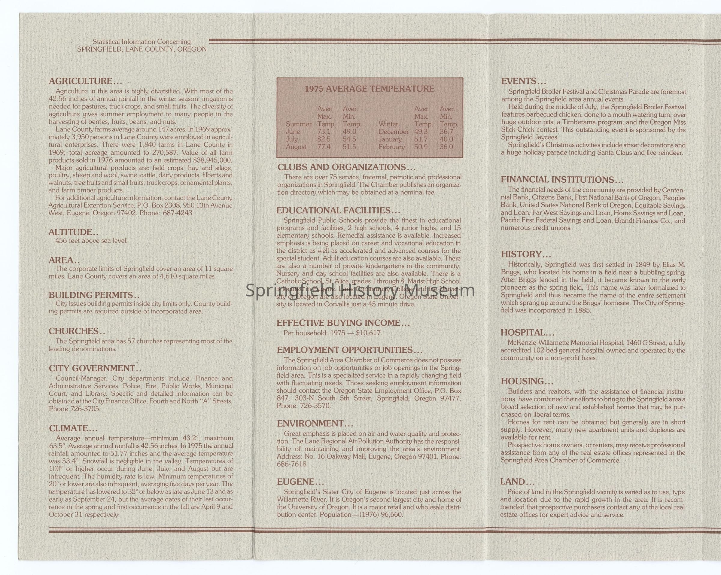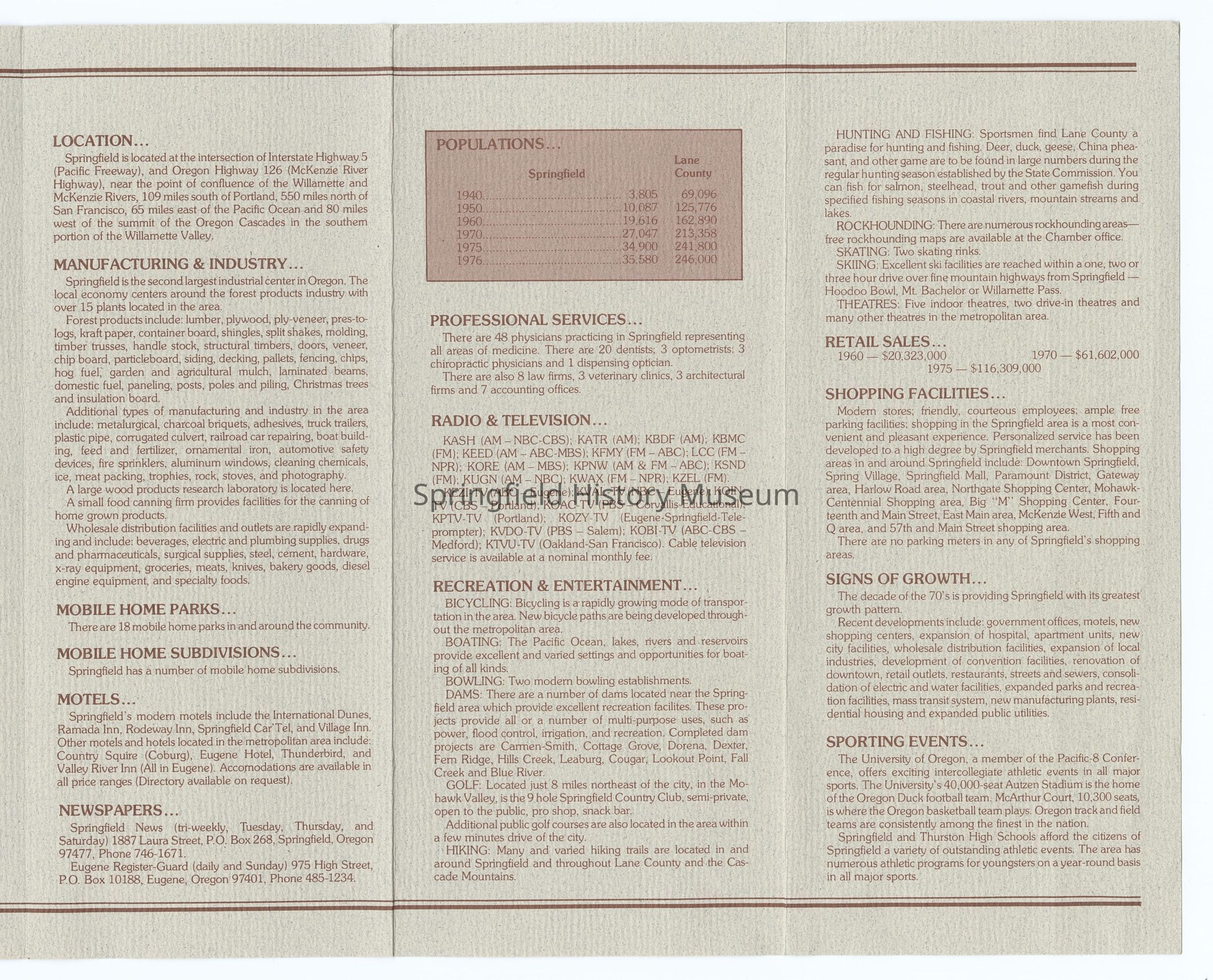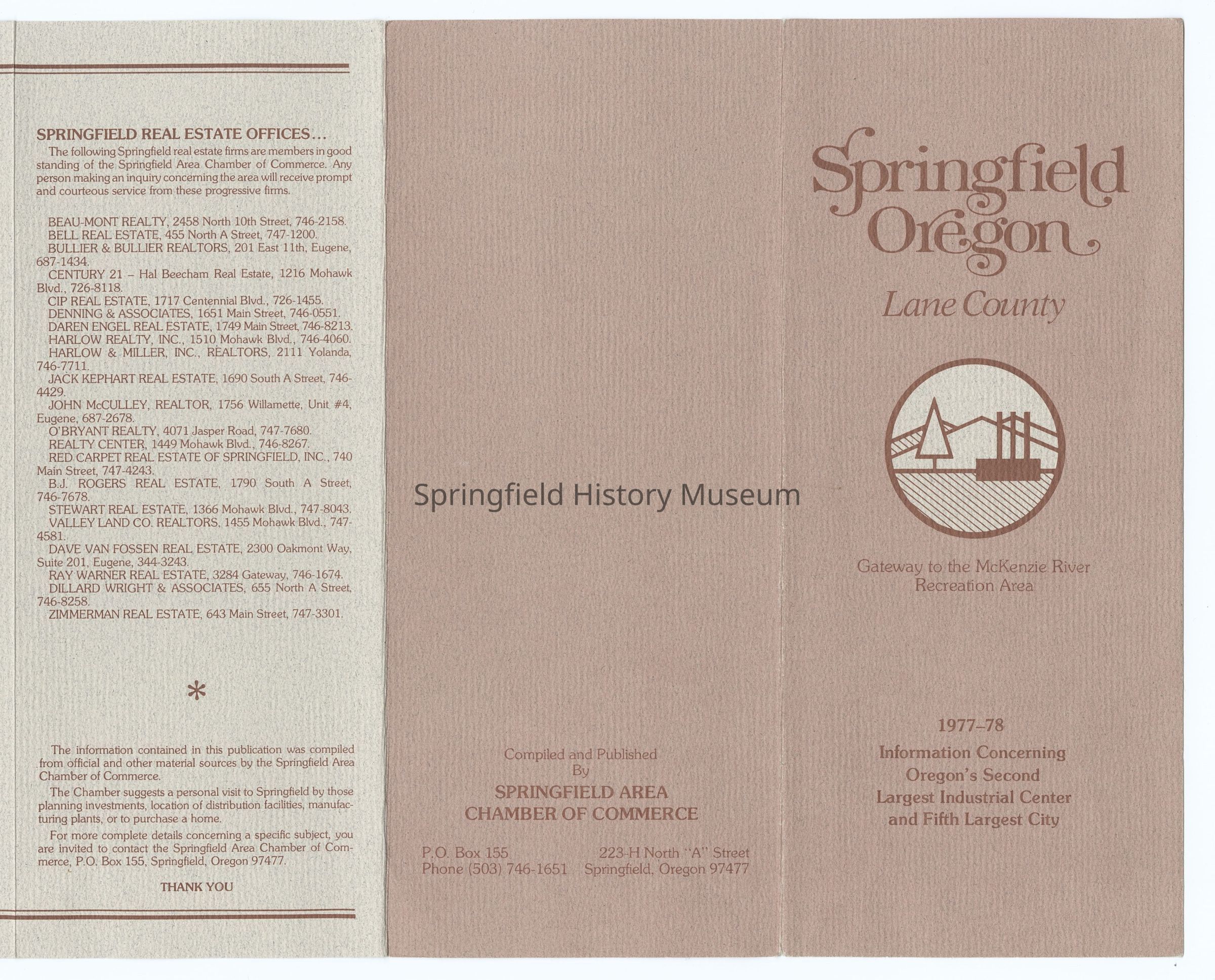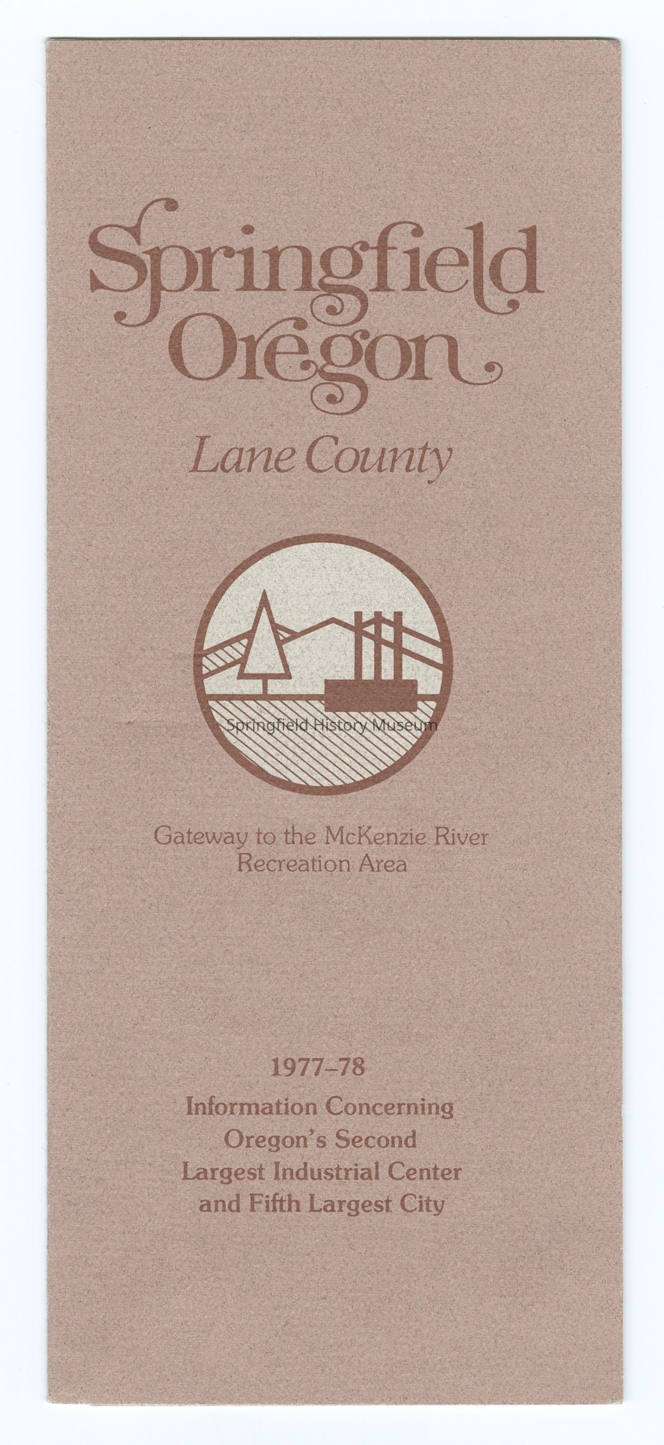 6-panel folded informational brochure titled "1977-1978, Information Concerning Oregon's Second Largest Industrial Center and Fifth Largest City", contains statistical data on Springfield. Pink-toned brochure. Compiled by Springfield Chamber of Commerce.Context