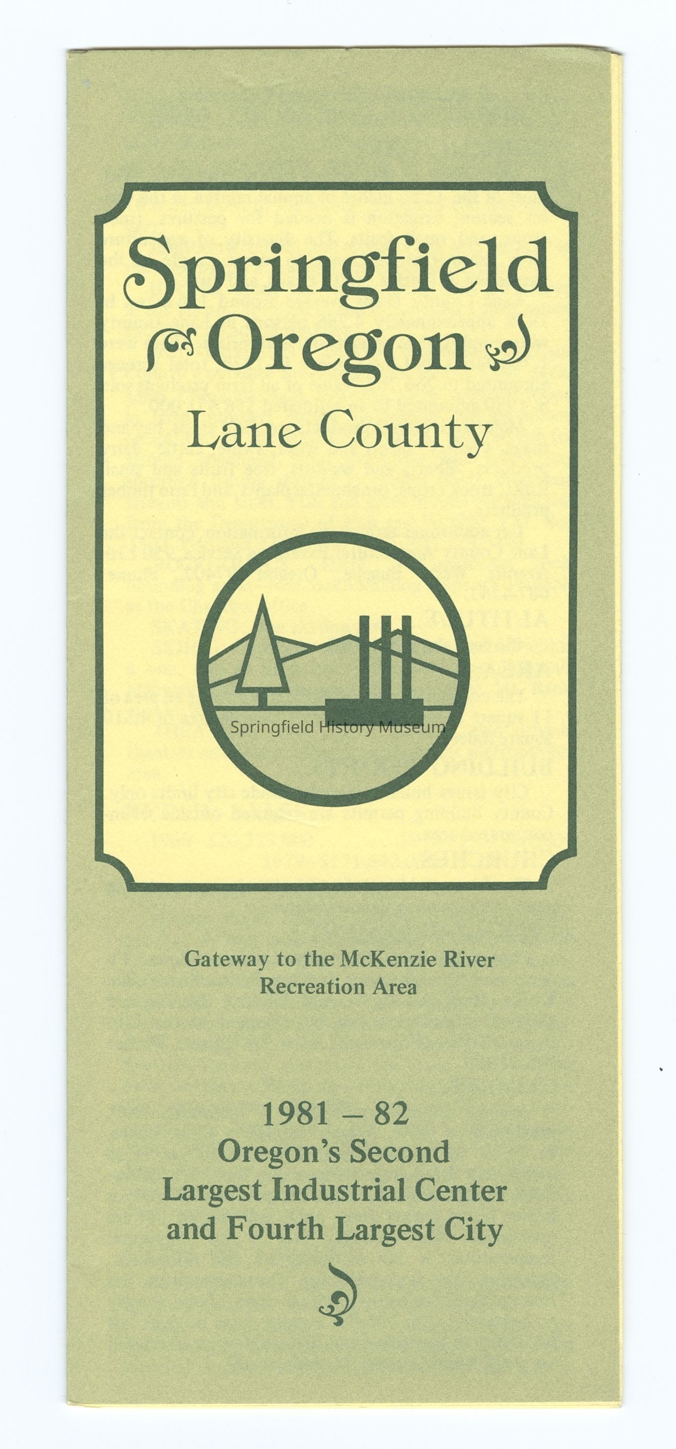 6-panel folded informational brochure titled "1981-1982, Oregon's Second Largest Industrial Center and Fourth Largest City", contains statistical data on Springfield. Green-toned brochure. Compiled by Springfield Chamber of Commerce.Context