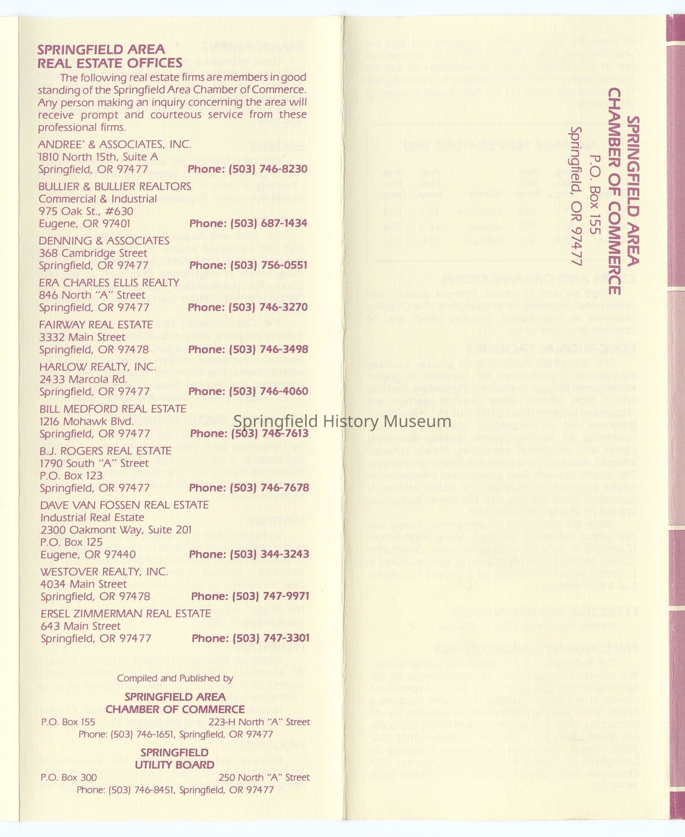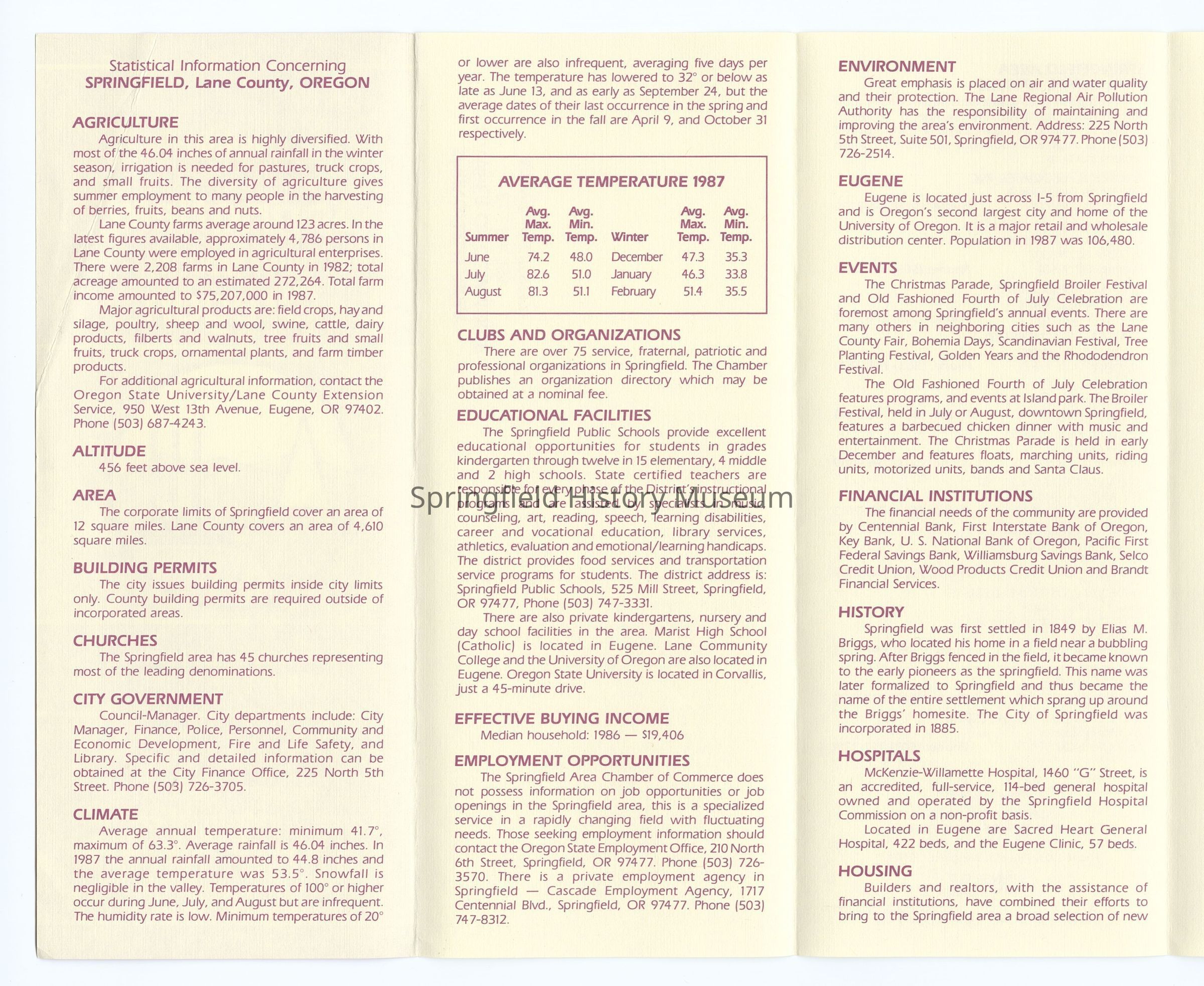 6-panel folded informational brochure titled "1988-1990, Oregon's Second Largest Industrial Center and Seventh Largest City", contains statistical data on Springfield. Red-toned brochure. Compiled by Springfield Chamber of Commerce.Context