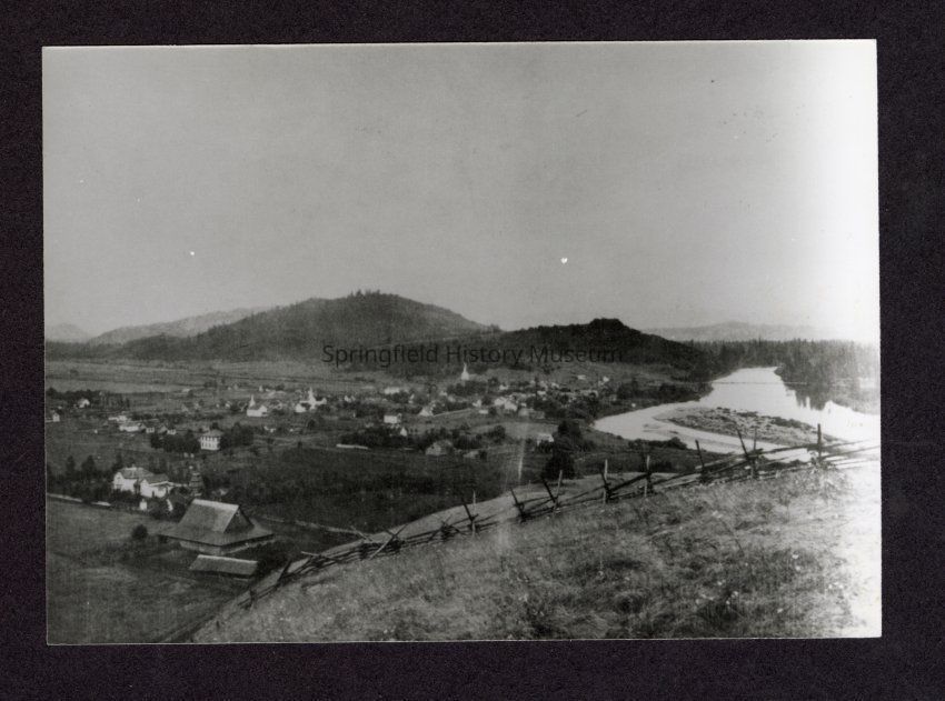Black and white photograph of early Springfield from Kelly Butte, looking south toward Willamette Heights. Wooden fence in foreground, overview of Springfield in center, Willamette River on right.