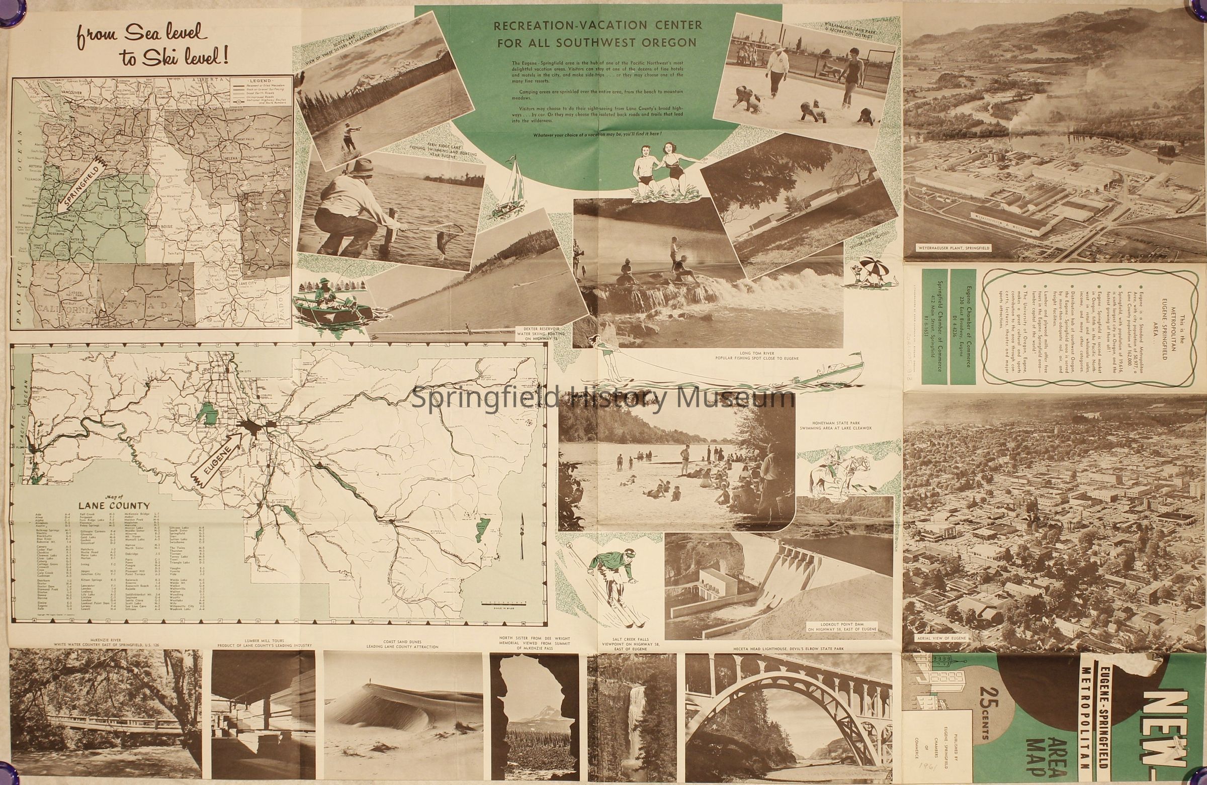 Map of Metropolitan Eugene and Springfield, 1961. Has basic facts and photographs about Springfield and Eugene.Context