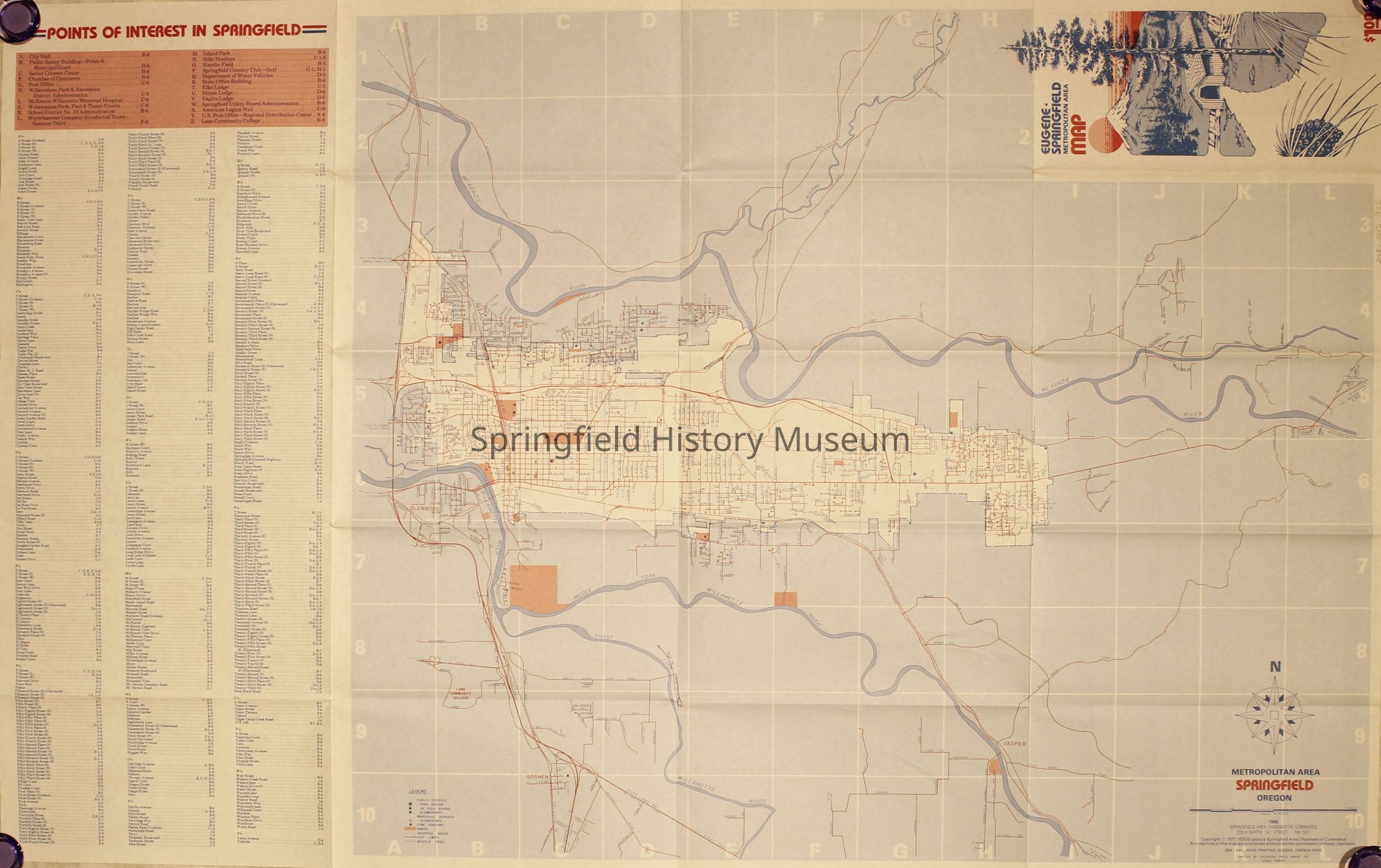 Map of Metropolitan Eugene and Springfield, 1980. Blue and red lay-out with covered bridge on front.Context