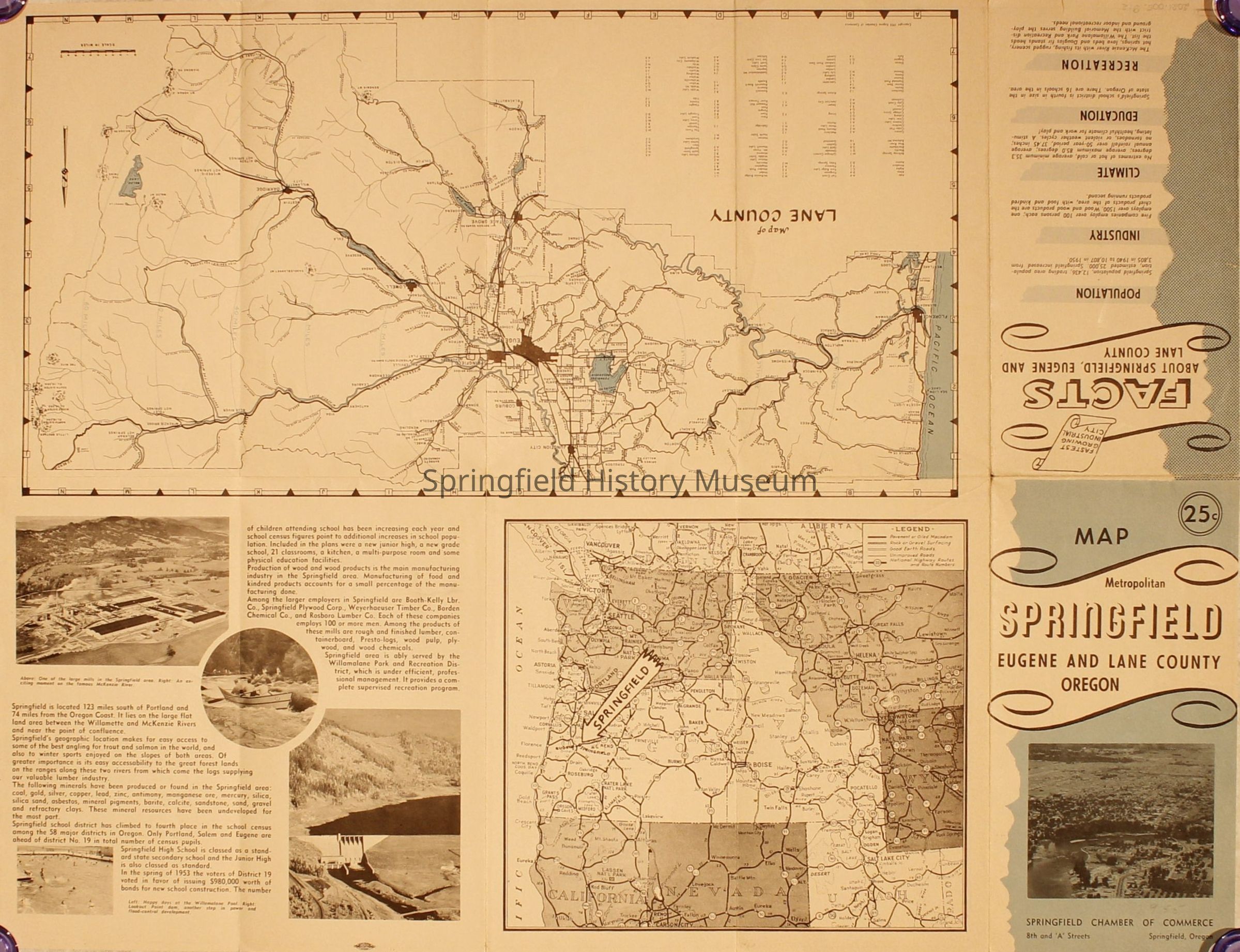 Map of Metropolitan Springfield, Eugene and Lane County, Oregon, 1955. Has basic facts and photographs about Springfield and Eugene.Context