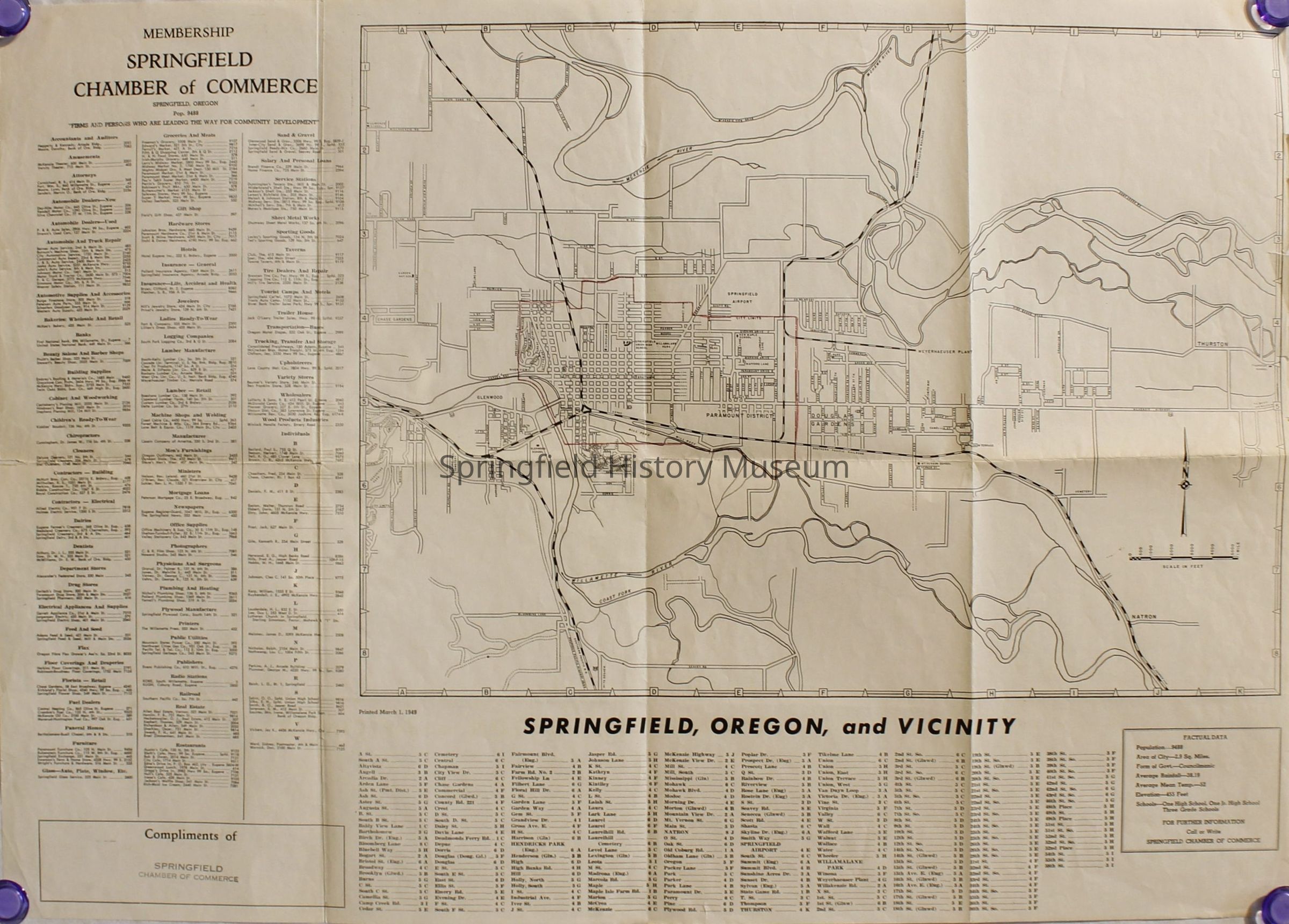 Map of Springfield "Membership Springfield Chamber of Commerce", showing Springfield businesses and facts about Springfield, 1949Context