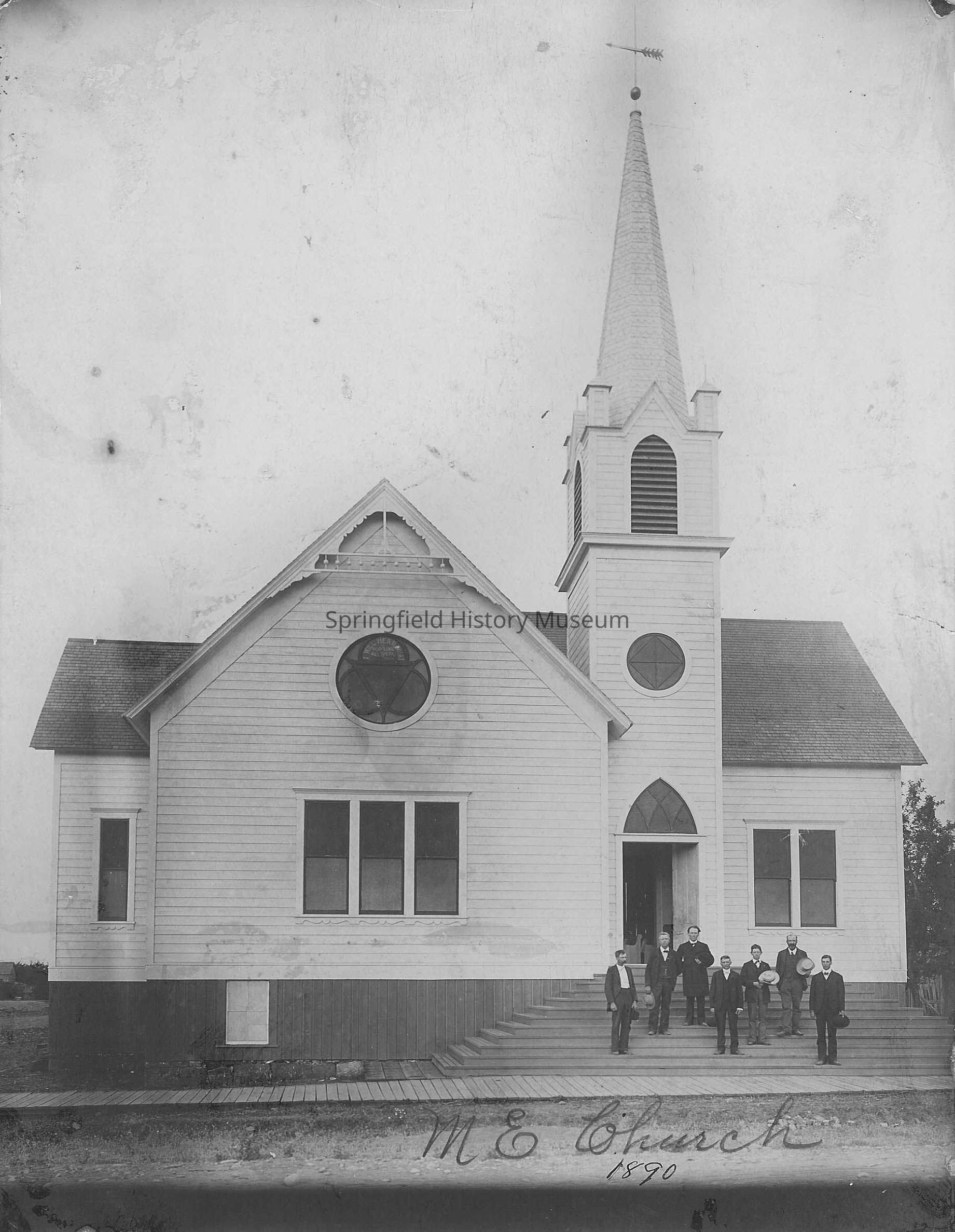 Methodist Episcopal Church, seven unidentified men standing on steps. 1890.