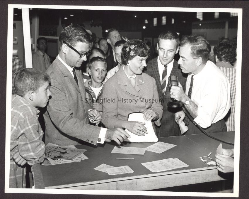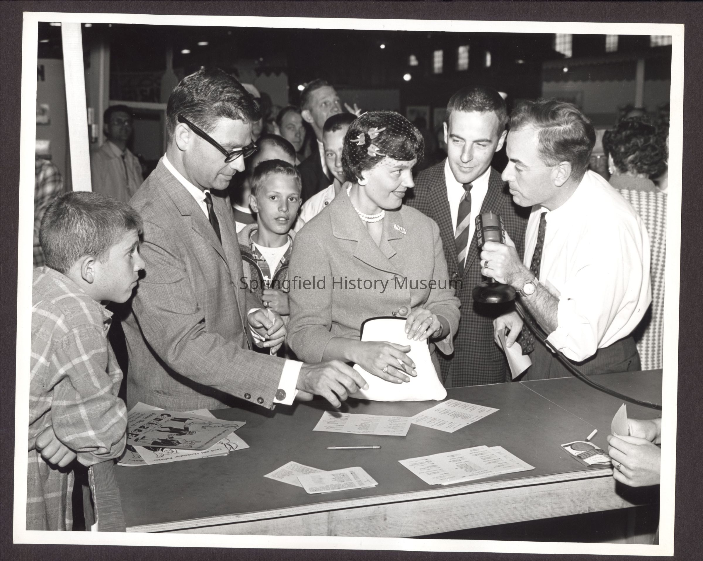 B&W Photo of Mrs. Hatfield being interviewed by unknown man from KUGN. She wearing a suit; a Nixon pin on her left collar, a pearl necklace, and a net whimsy. A large crowd of people surrounds her.