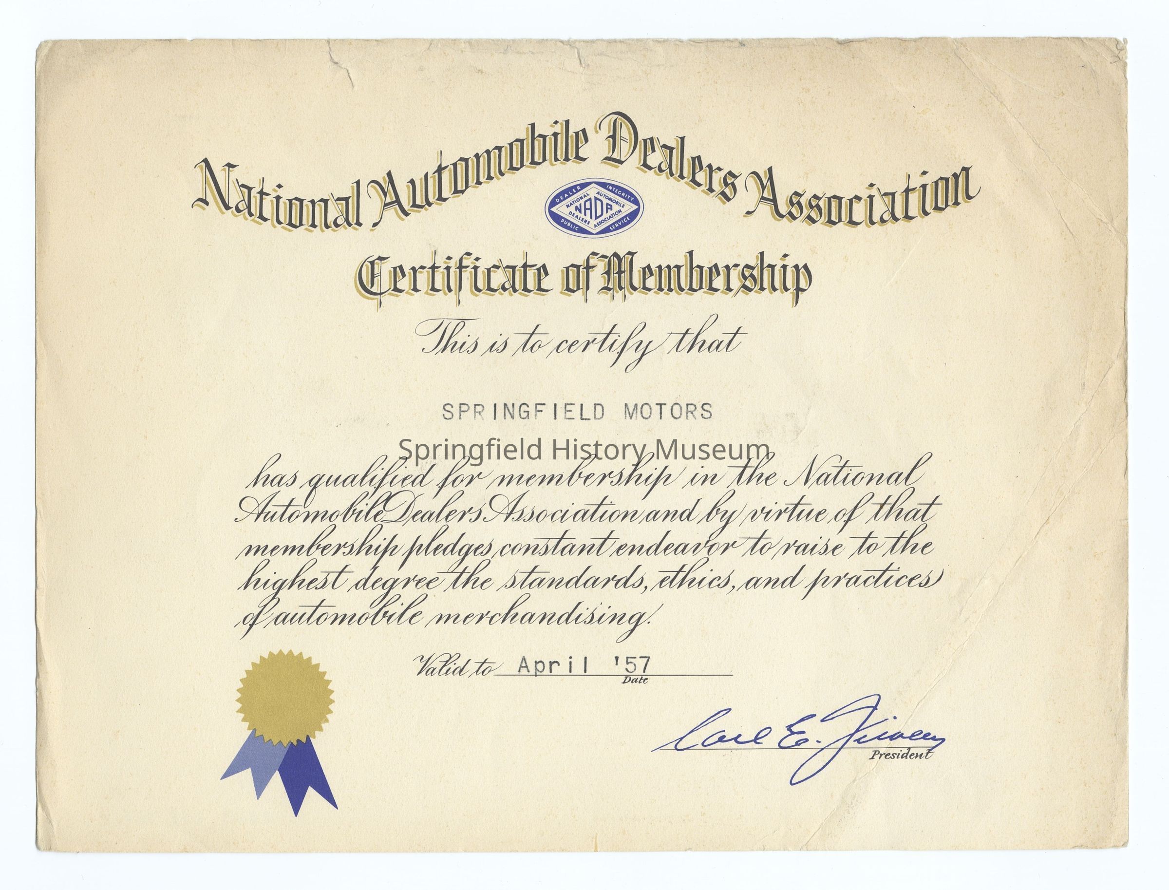 National Automobile Dealers Association Certificates of Membership, Springfield Motors, 1957-1968Entry/Object ID