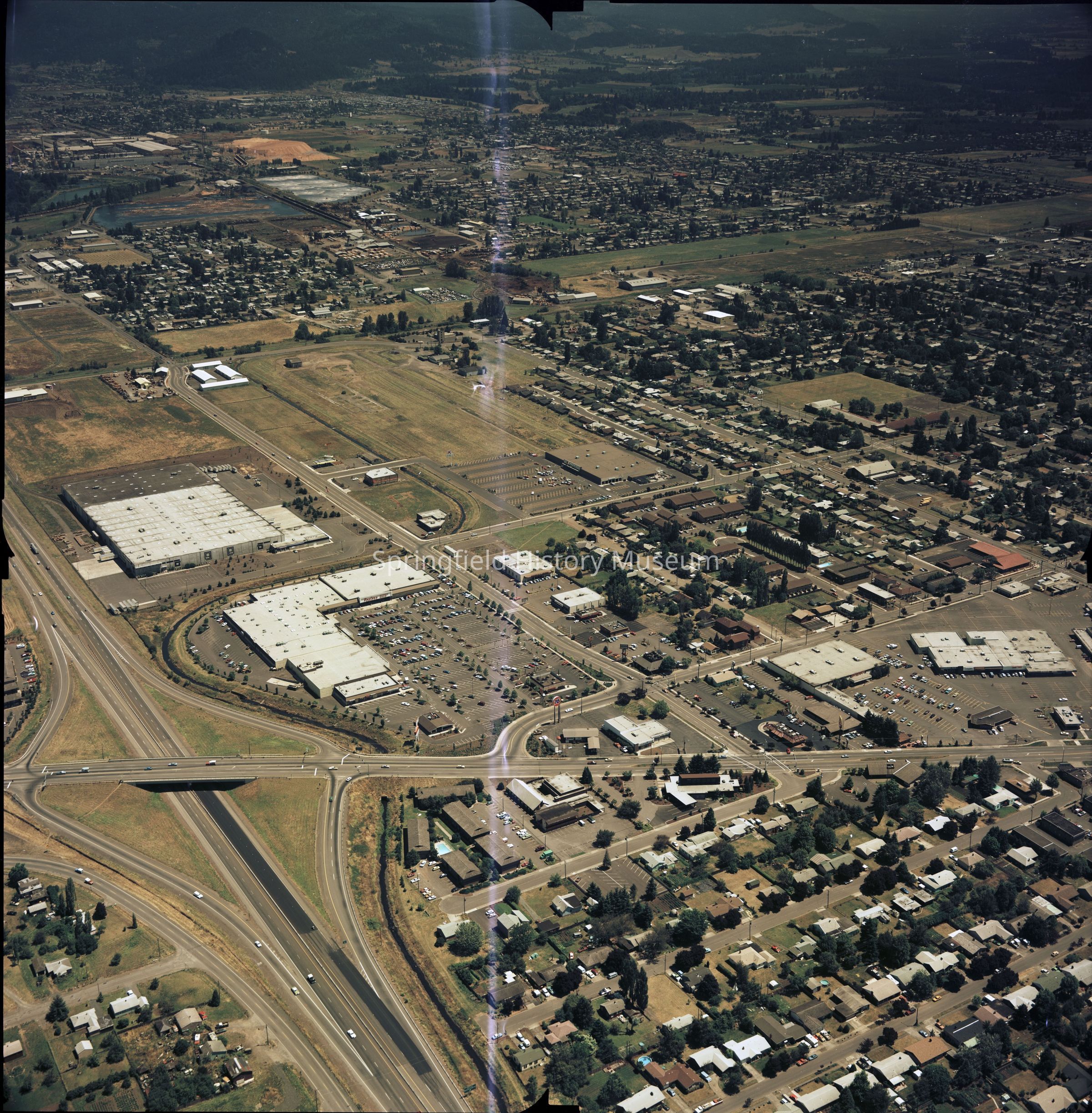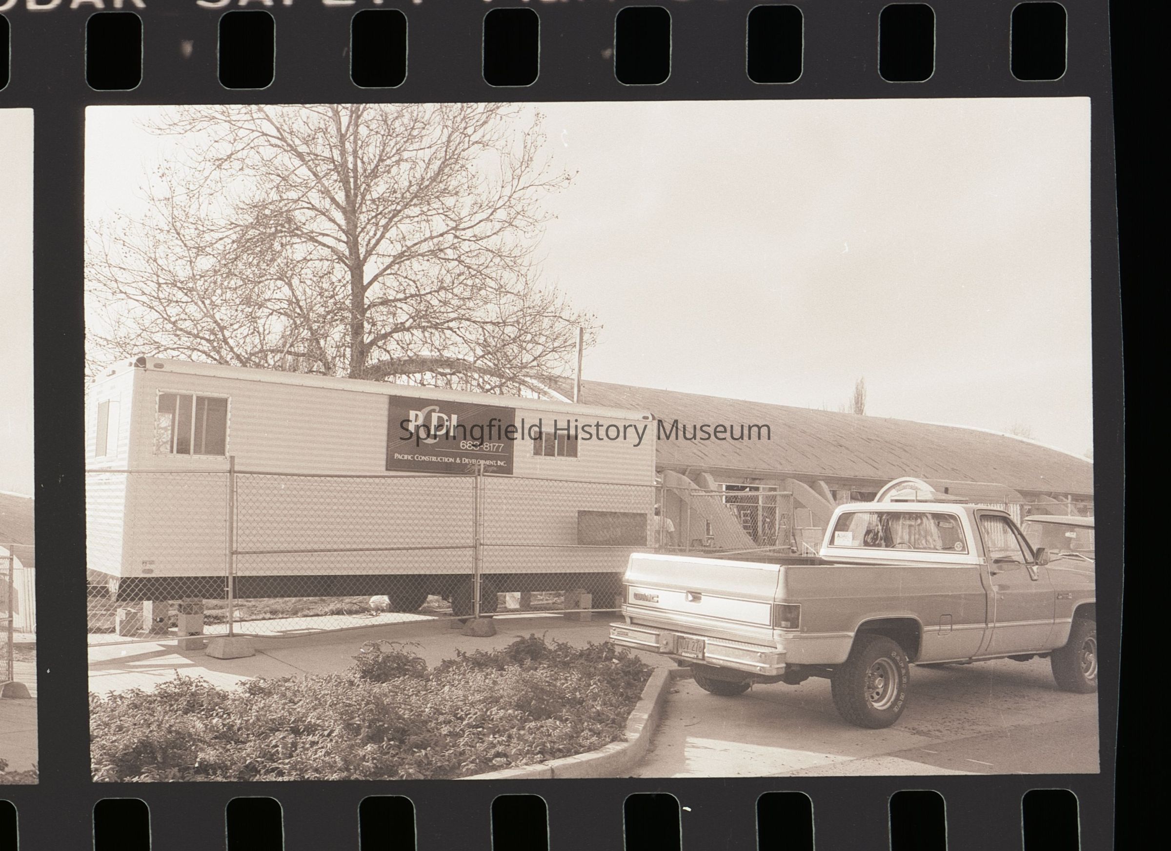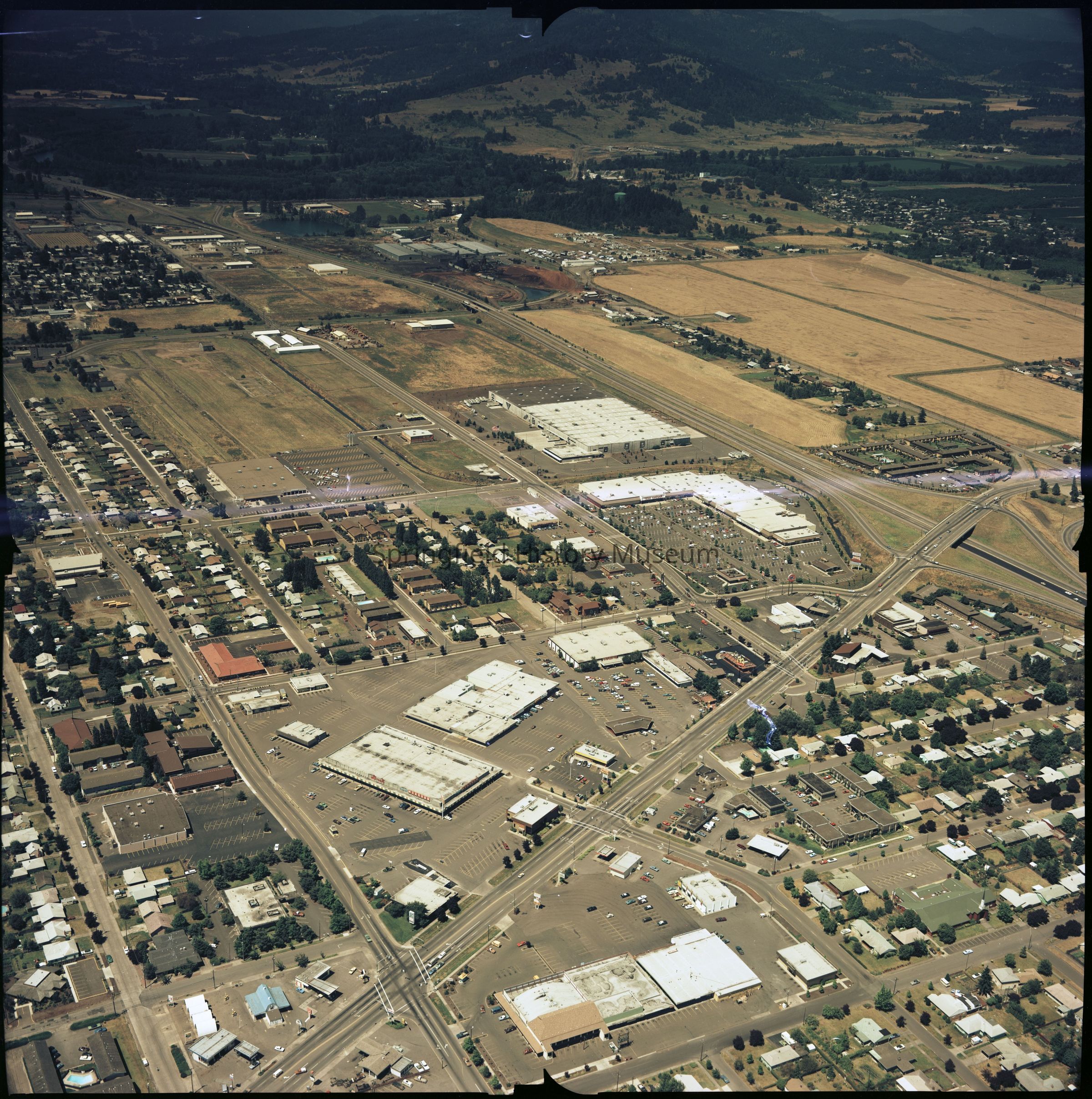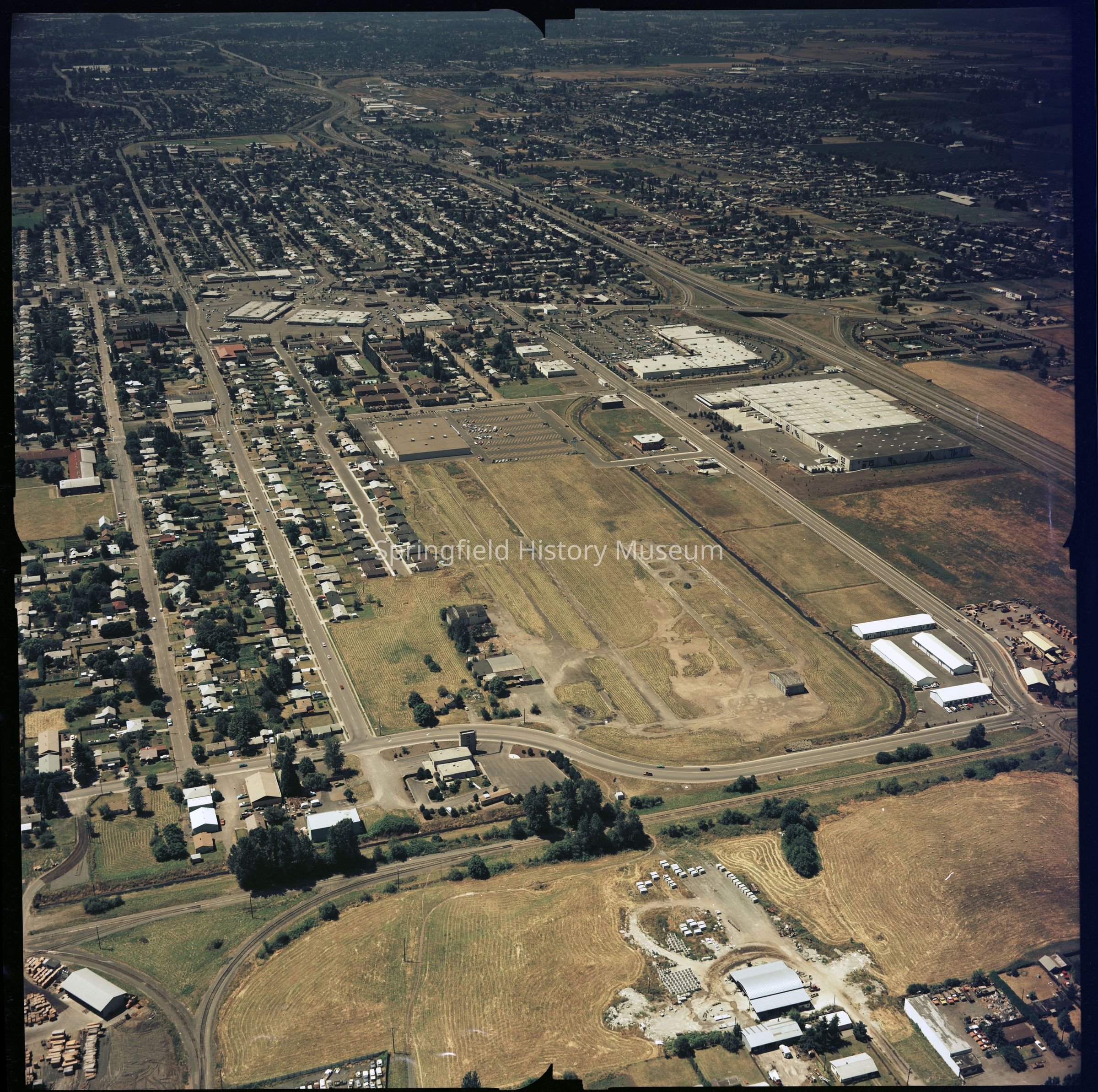 Envelope 10: 5 x 4 Negatives of Springfield buildings and businesses (Borden Chemical, covered bridge, Depot Chamber of Commerce Building, old Depot, aerials, pumpkin patch, Lane Community College (same as 2021.005.127)), circa 1980 - 1990, circa 10 negatives (partially digitized, new images only 2021-005-1027_img-077 to 081)