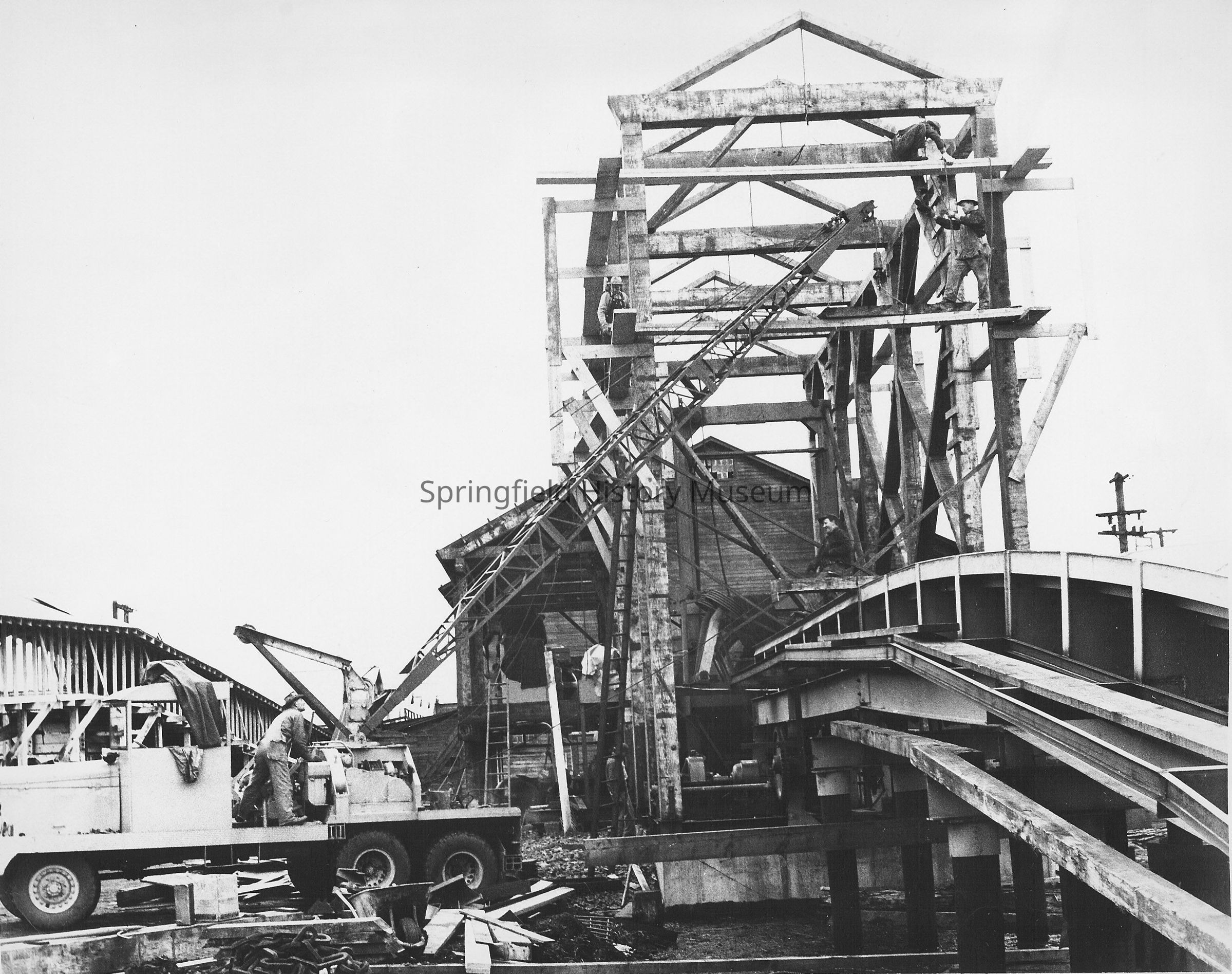 Men working on the new barker shed at Booth-Kelly mill during the 1956 renovations.