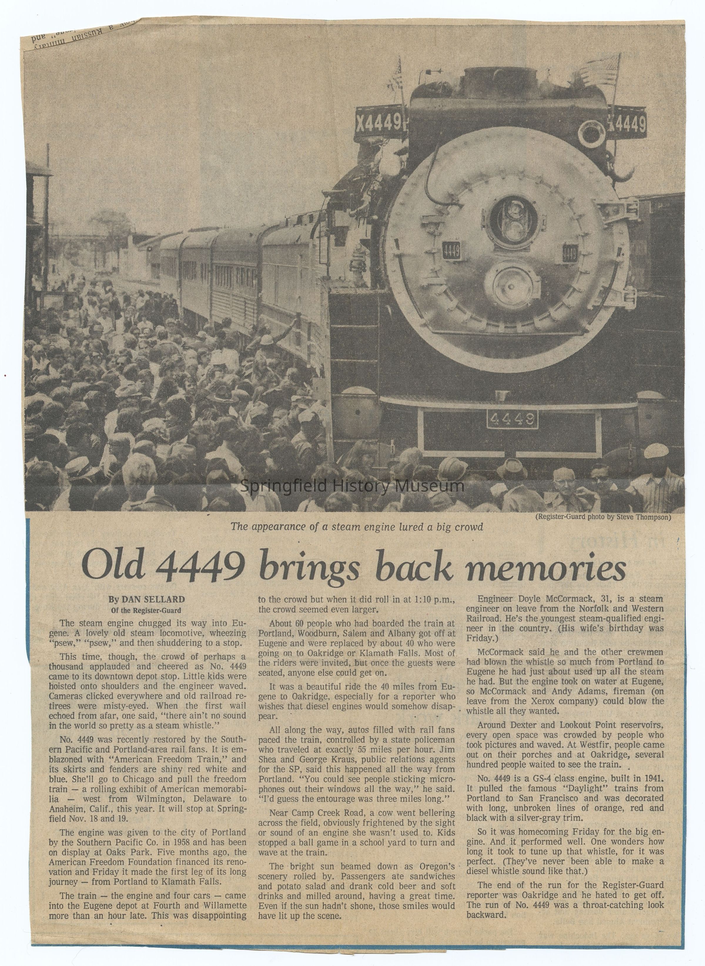 Newspaper article from Register-Guard "Old 4449 brings back memories", on old steam train, undatedContext