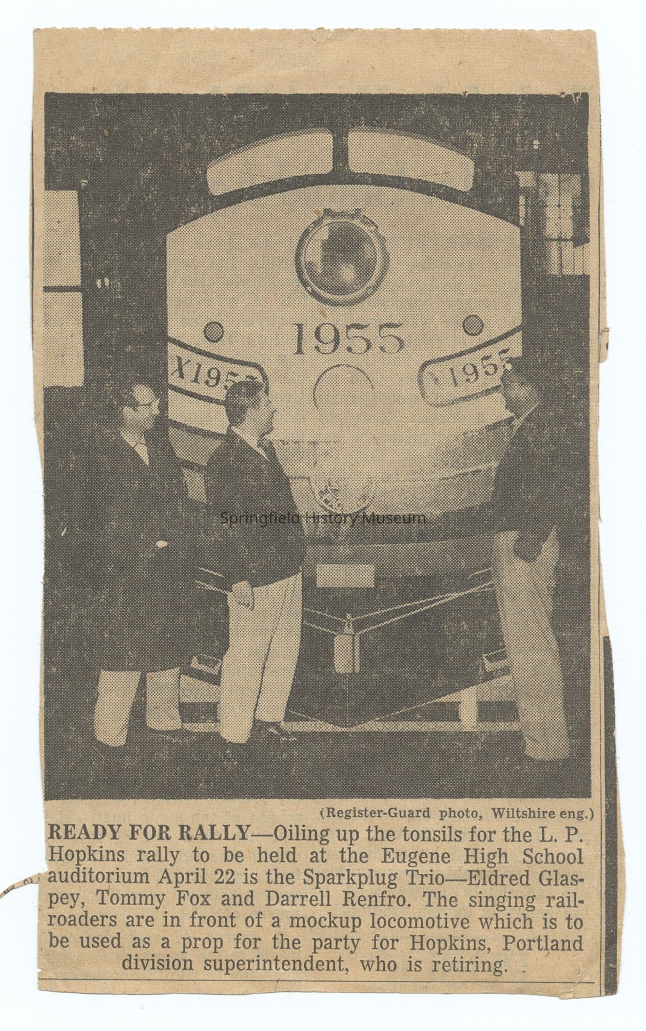Transcription: 'Ready for Rally. Oiling up the tonsils for the L.P. Hopkins rally to be held at the Eugene High School auditorium April 22 is the Sparkplug Trio - Eldred Glaspey, Tommy Fox, and Darrell Renfro. The singing railroaders are in front of a mockup locomotive which is to be used as a prop for the party for Hopkins, Portland division superintendent, who is retiring.'Context