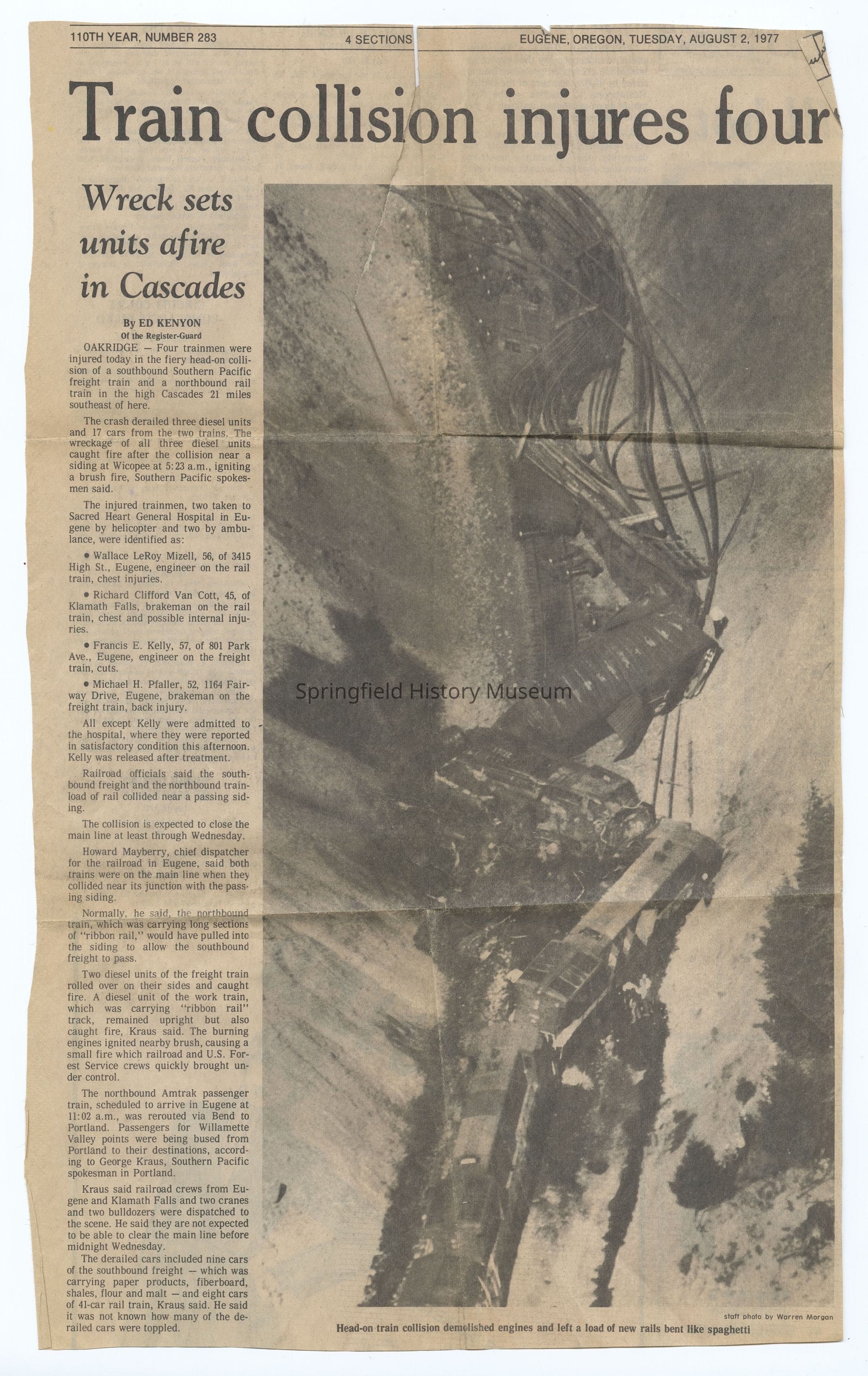 Article from Register Guard about a train collision near Wicopee siding, Oregon, August 2nd 1977Context