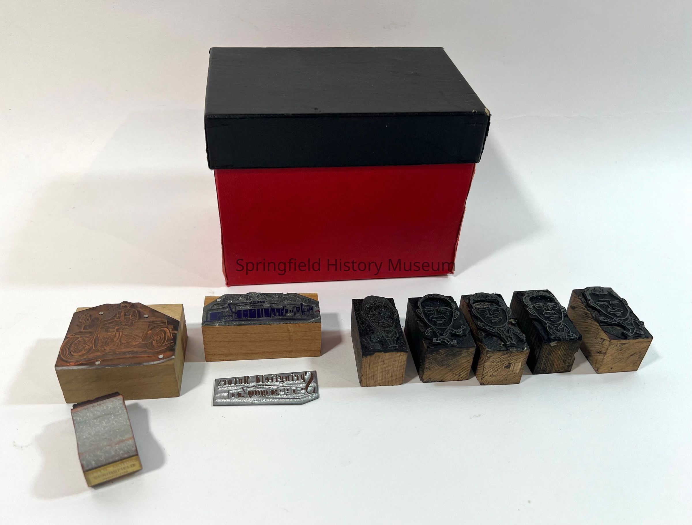 Red cardboard box containing 9 custom stamps, Springfield Buick, circa 1960