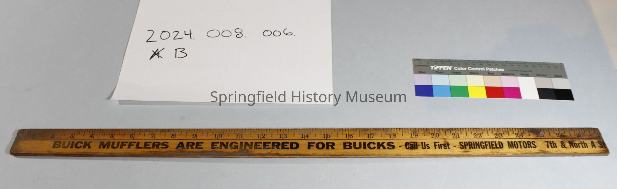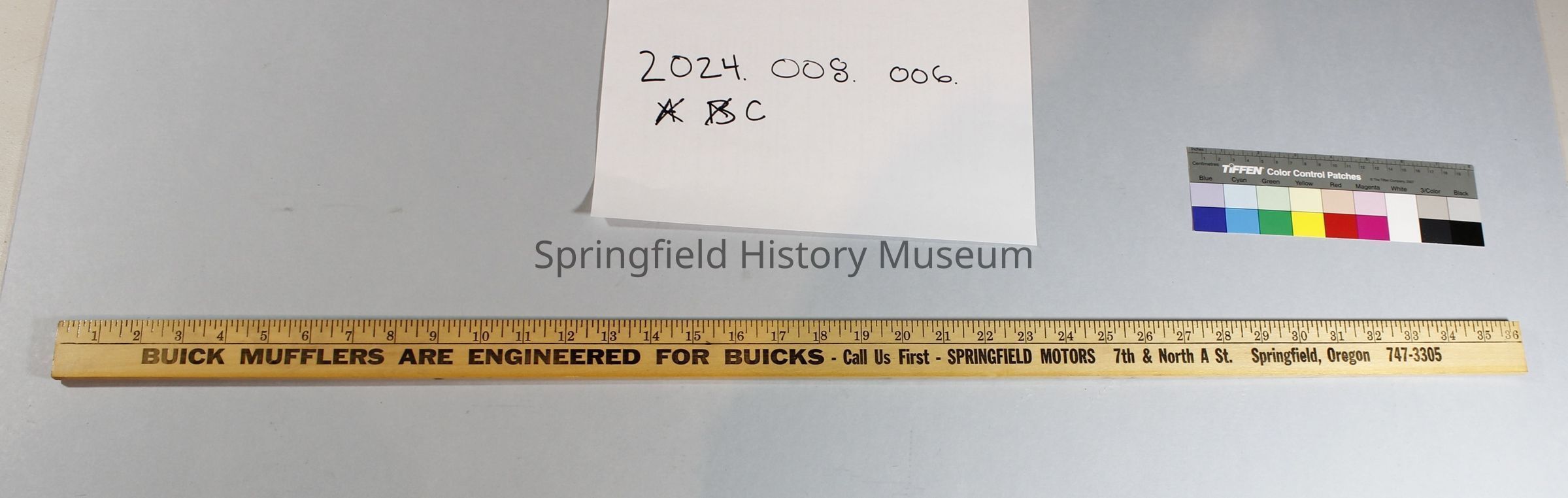Group of nine promotional wooden yardsticks, labeled A through I. Businesses listed are: Buick Springfield Motors (A, B, C), Robert Scherer Buick Eugene (D), Umpqua Produce and Hatchery Roseberg (E), Fred Meyer (F), Ace (G), LTD Lane Transit District (H), Delta Lumber Co (I)Collection