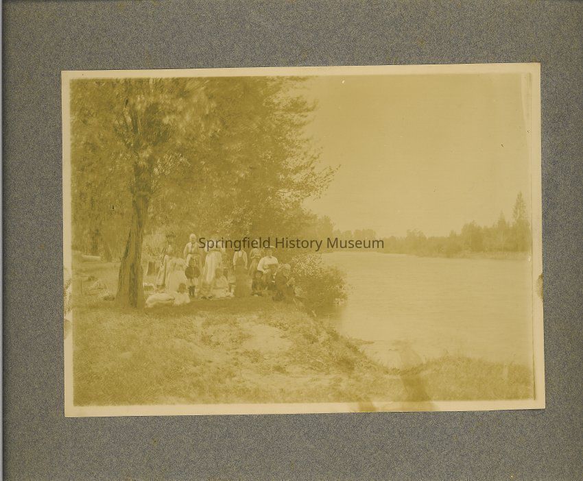 The Oldham Family. [15people] picnicing and fishing along the McKenzie River, 1905-1915.