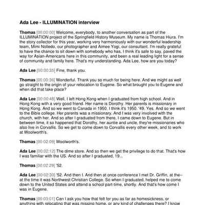 This oral history interview with Ada Lee was conducted by Thomas Hiura in a single session in November of 2022 for the Springfield History Museum's Oral History Project "ILLUMINATION 2022-23: AANHPI Experience". Transcript in English.