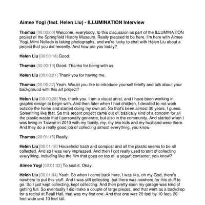 This oral history interview with Aimee Yogi featuring Helen Liu was conducted by Thomas Hiura at Hearts for Hospice in Springfield in a single session in November of 2022 for the Springfield History Museum's Oral History Project "ILLUMINATION 2022-23: AANHPI Experience". Transcript in English.