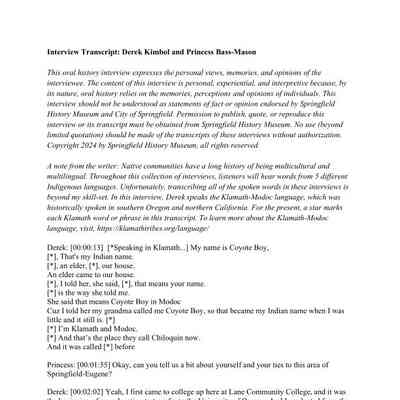 This Oral History interview expresses the personal views, memories, and opinions of the interviewee. The content of this interview is personal, experiential, and interpretive because, by its nature, oral history relies on the memories, perceptions and opinions of individuals. This interview should not be understood as statements of fact or opinion endorsed by the Springfield History Museum, City of Springfield, or sponsors. Permission to publish, quote, or reproduce this interview or its transcript must be obtained from Springfield History Museum. No use (beyond limited quotation) should be made of the transcripts of these interviews without authorization. Copyright 2024 by Springfield History Museum, All Rights Reserved. For all other uses please contact springfieldmuseum@springfield-or.gov.