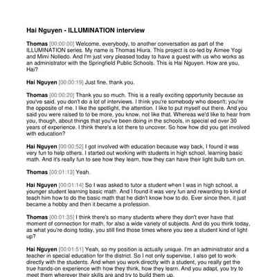 This oral history interview with Hai Nguyen was conducted by Thomas Hiura at the Springfield Public Library in a single session in November of 2022 for the Springfield History Museum's Oral History Project "ILLUMINATION 2022-23: AANHPI Experience". Transcript in English.