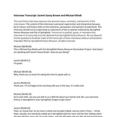 This oral history interview with Jasmine Brown was conducted by Michael Klindt in a single session in December 2023 for the Springfield History Museum's Oral History Project "ILLUMINATION 2023-24: Black African American Experience". Transcript in English.