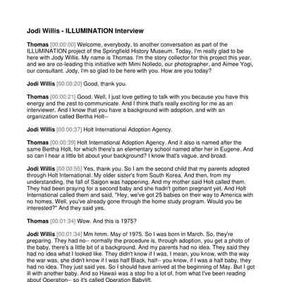 This oral history interview with Jodi Willis was conducted by Thomas Hiura at the Springfield Public Library, in a single session, in November of 2022, for the Springfield History Museum's Oral History Project "ILLUMINATION 2022-23: AANHPI Experience". Transcript in English.