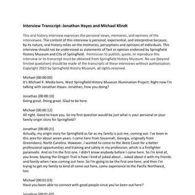 This Oral History interview expresses the personal views, memories, and opinions of the interviewee. The content of this interview is personal, experiential, and interpretive because, by its nature, oral history relies on the memories, perceptions and opinions of individuals. This interview should not be understood as statements of fact or opinion endorsed by the Springfield History Museum, City of Springfield, or sponsors. Permission to publish, quote, or reproduce this interview or its transcript must be obtained from Springfield History Museum. No use (beyond limited quotation) should be made of the transcripts of these interviews without authorization. Copyright 2023 by Springfield History Museum, All Rights Reserved. For all other uses please contact springfieldmuseum@springfield-or.gov.